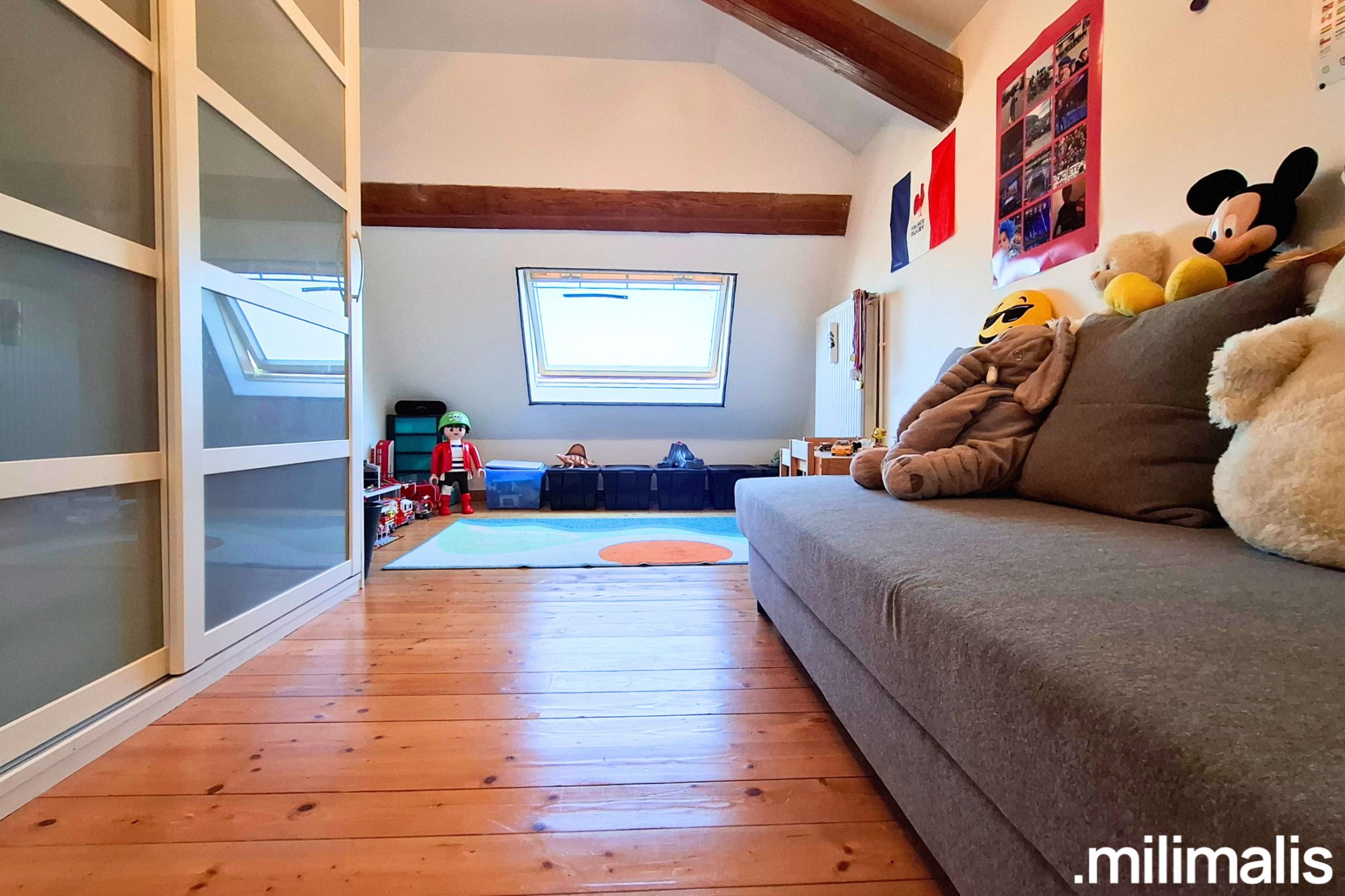 L'appartement, en duplex, développe 80 m² habitables (plus de 100 m² au sol). Il offre un espace de vie de plus de 45 m², lumineux et chaleureux, avec poutres apparentes et hauteur sous plafond, véritable signature de ce lieu atypique.
