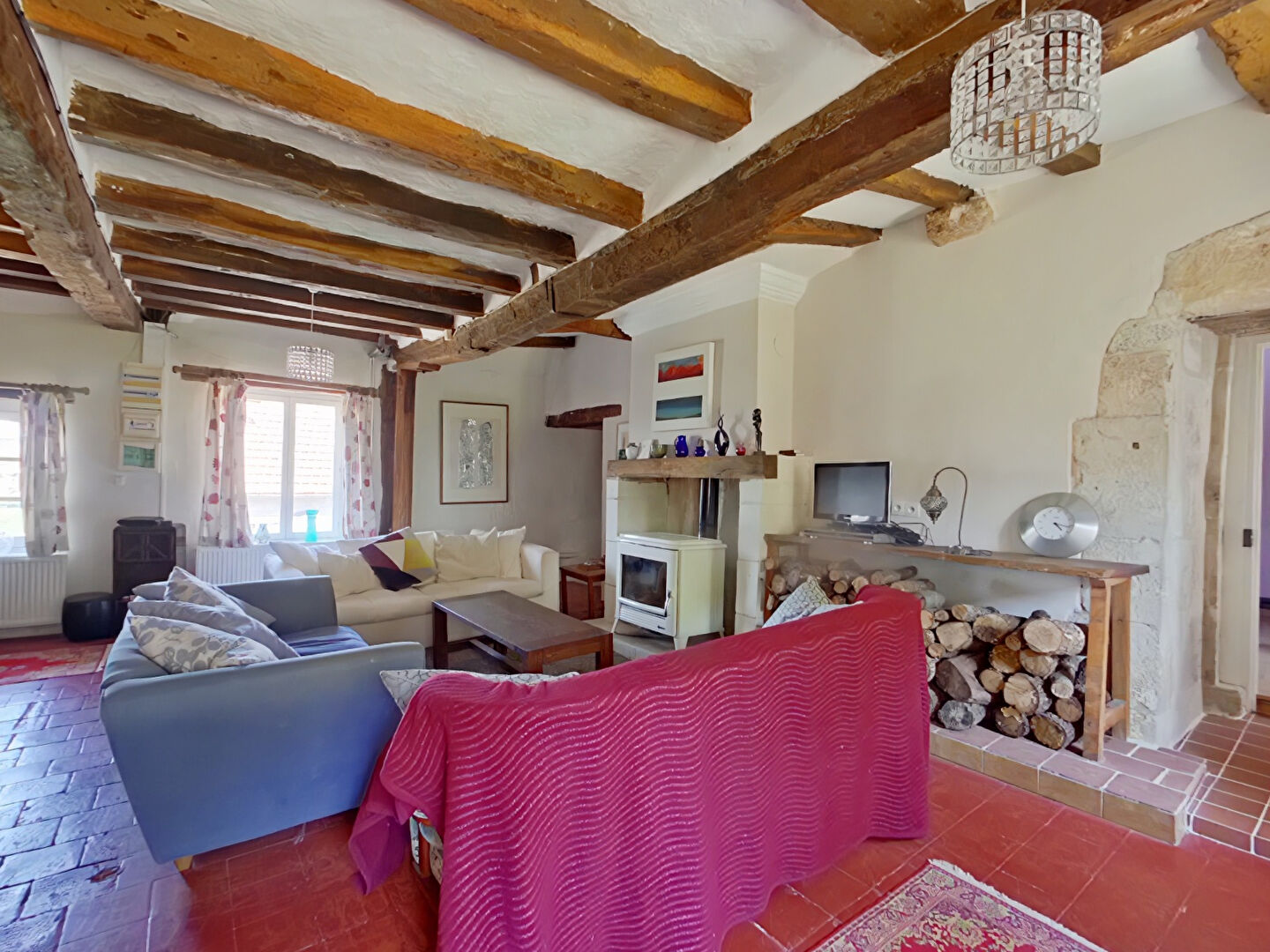 A l'étage, beau salon séjour avec poêle à bois, chambre, salle d'eau avec wc.