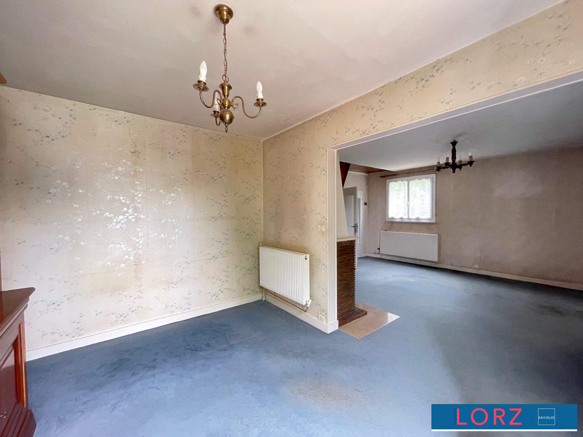 Maison des années 60 avec garage attenant comprenant une entrée, une salle à manger avec cheminée avec salon, une cuisine aménagée, une pièce intermédiaire avec grand cellier donnant sur le garage puis l'espace nuit desservi par un couloir : une salle de bains, 3 chambres dont une avec cabinet de toilettes et douche, une avec placard de rangement, un wc indépendant et une grande penderie.