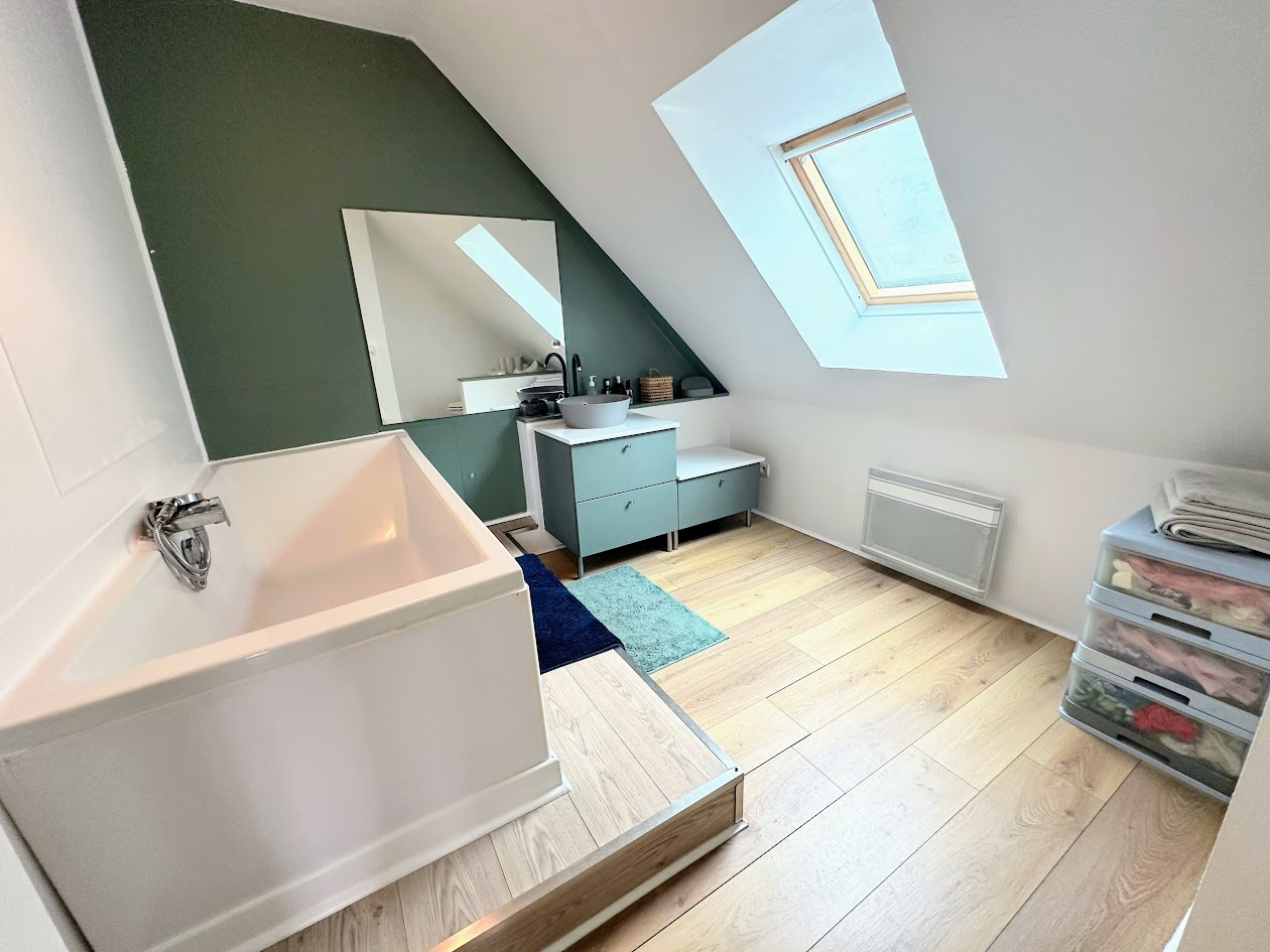 Grande pièce de vie de 60 m² avec cuisine ouverte, cheminée avec insert bois, Suite parentale au rez-de-chaussée : chambre, salle d'eau, WC, coin dressing.
