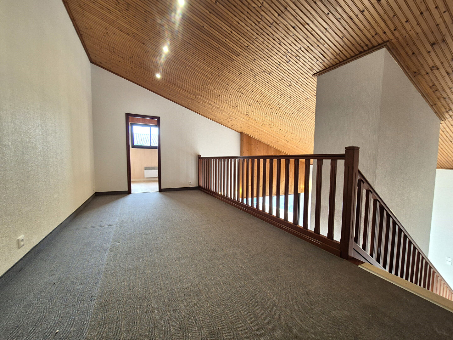 A l'étage on retrouve un grand espace ouvert pour le bureau, deux chambres supplémentaires et une salle de bains avec wc. Ce bien dispose également d'une cave et d'un grand garage.