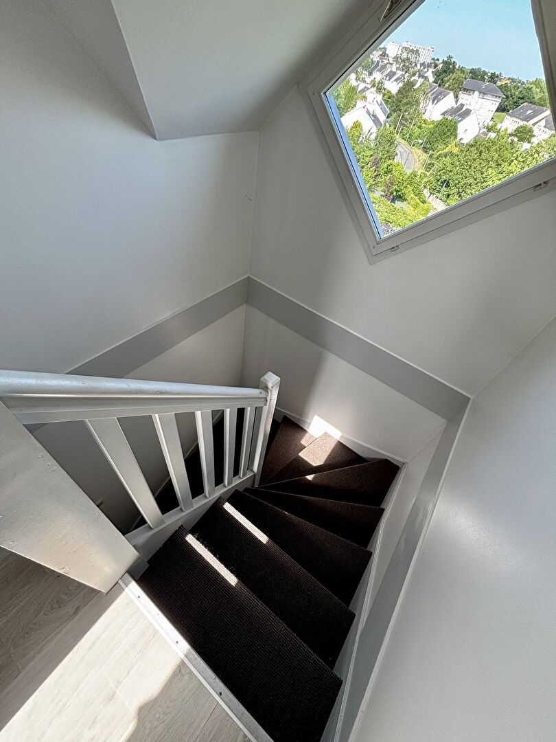Nouveauté, Quimper proximité centre ville coté Kerfeunteun, dans une petite résidence de qualité, Bel appartement T4 en duplex sur 107 m² utiles, offrant un hall, séjour salon s'ouvrant sur une terrasse, vue dégagée, cuisine aménagée, 3 chambres, sde avec douche italienne, 2 wc. Un excellent emplacement, et un excellent compromis entre la maison et l'appartement !