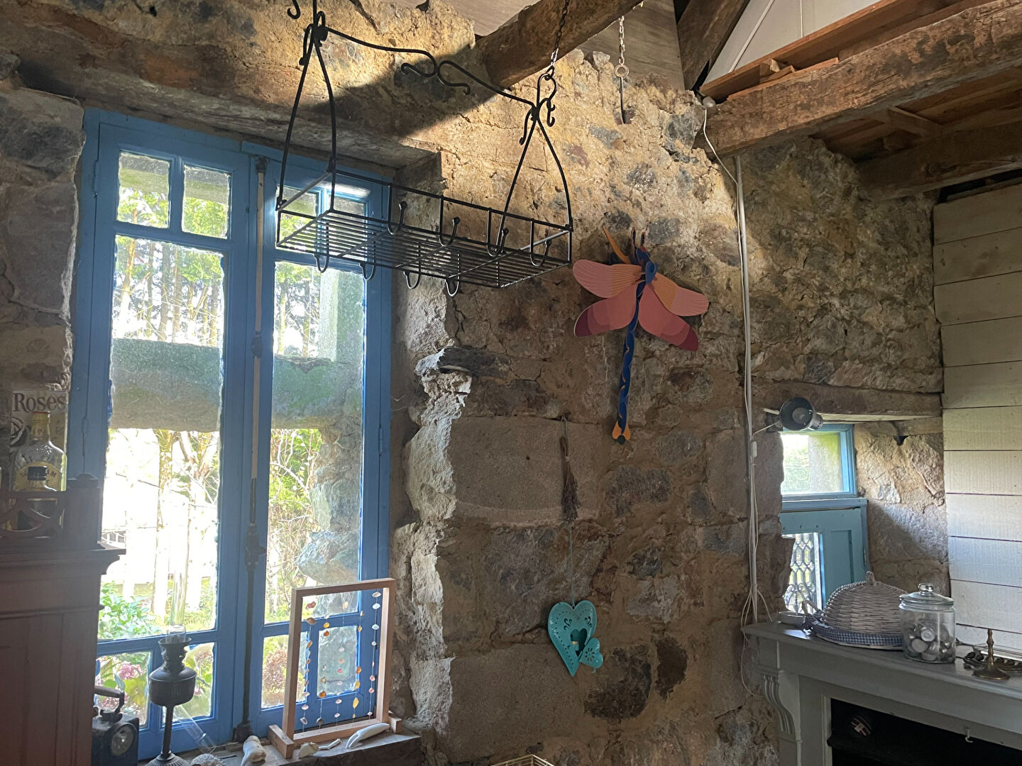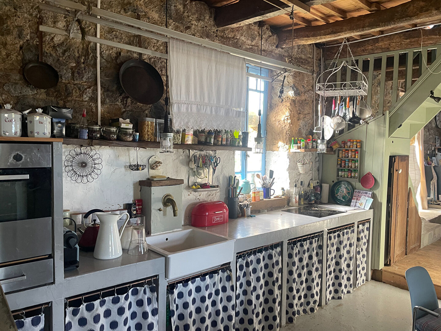 - Au rez-de-chaussée : une cuisine ouverte sur salon avec pierres et poutres apparentes, une salle d'eau, un wc