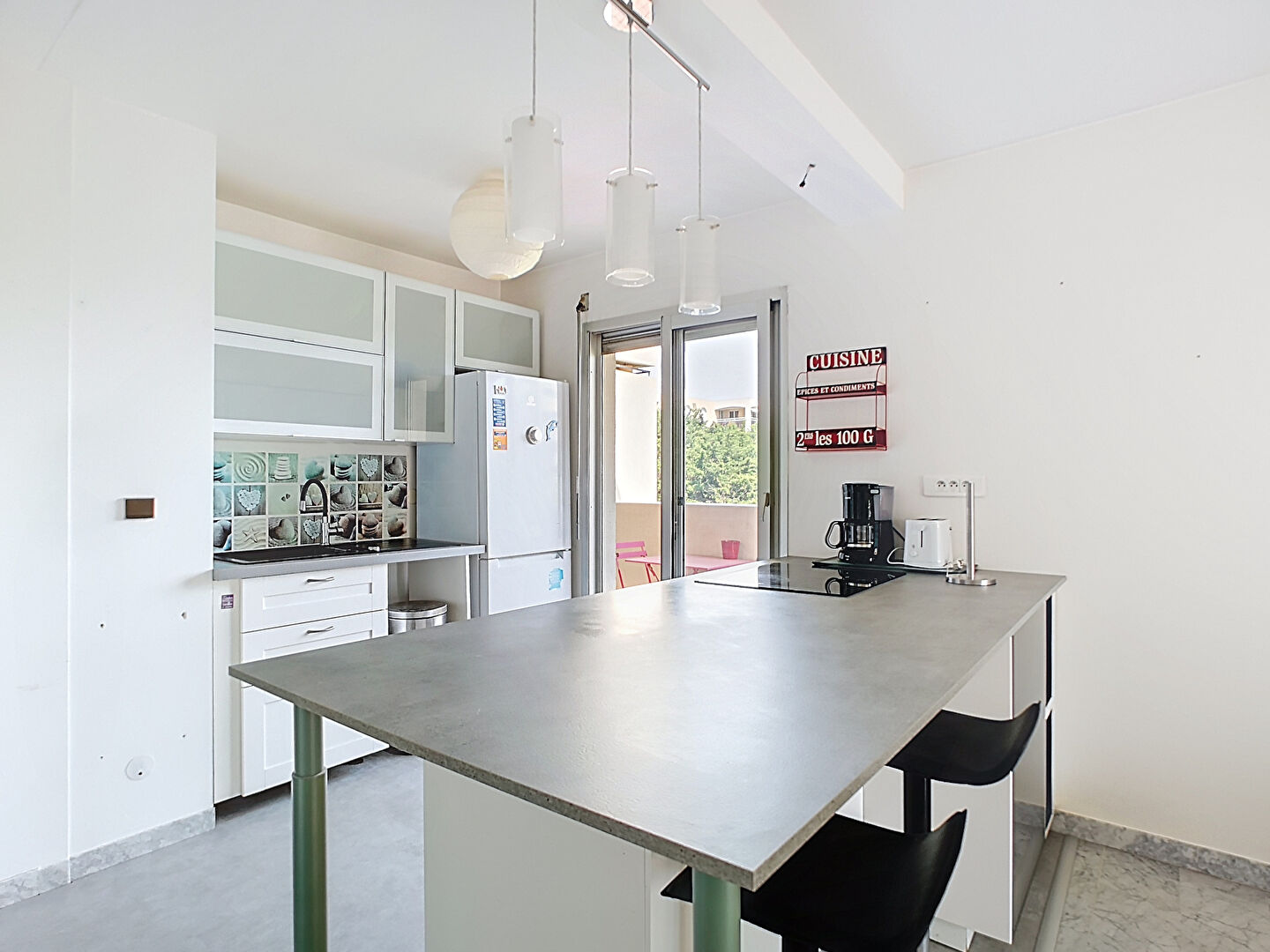 Dans une résidence de standing, avec piscine, tennis, gardien et espaces verts, grand deux pièces de 50m² d'angle vendu meublé, avec 2 terrasses incluant un espace repas et un pour la détente, exposées Sud et EST avec vue sur parc et aperçue mer ! Au calme, cet appartement tourné intégralement sur l'extérieur et le soleil, se compose d'une entrée avec rangements, une cuisine américaine équipée et aménagée, un dégagement pour desservir l'espace nuit dont la chambre spacieuse avec placard, la salle de bains, un dressing et un wc séparé. Un garage privatif complète le bien ainsi qu'une cave + places visiteurs dans la résidence.