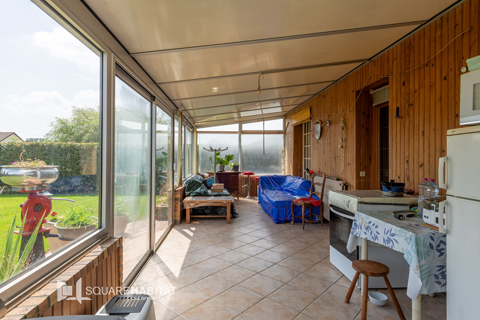 - au rez-de-chaussée : entrée, salle (13.9m²), salon (13.9m²) avec cheminée insert, cuisine ( 9.24m²), WC, véranda (29m²), chambre (11.8m²) et salle de bains avec douche.
