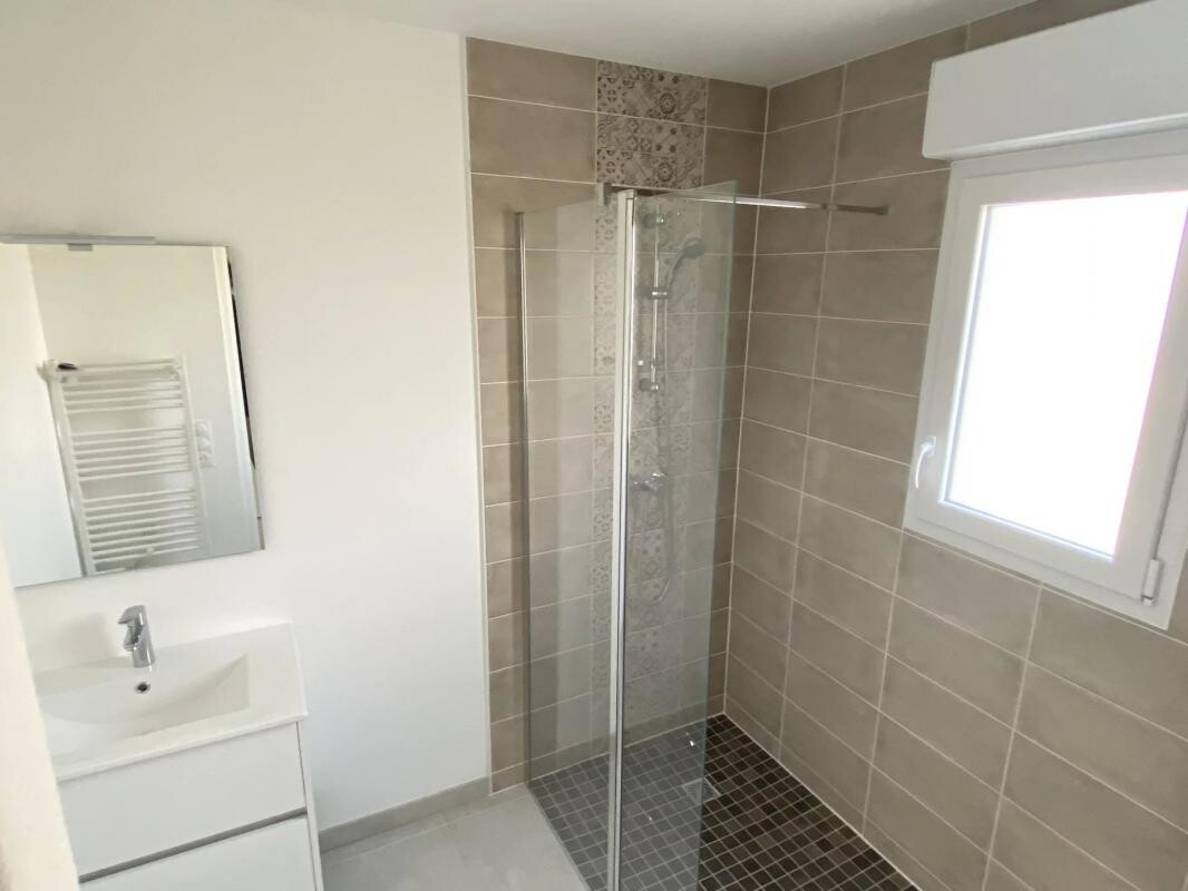 La maison : Elle est mitoyenne d'un seul côté, et réalisée sur un terrain de 228 m² engazonné et clos orienté sud-est / nord-ouest. La maison possède un garage intégré de 17,14 m², une entrée indépendante de 5 m² avec placard, une salle d'eau et un wc, puis la pièce de vie, spacieuse et lumineuse, salon-séjour-cuisine équipée de 32 m² environ, orientée, avec accès direct à la terrasse de 9 m².