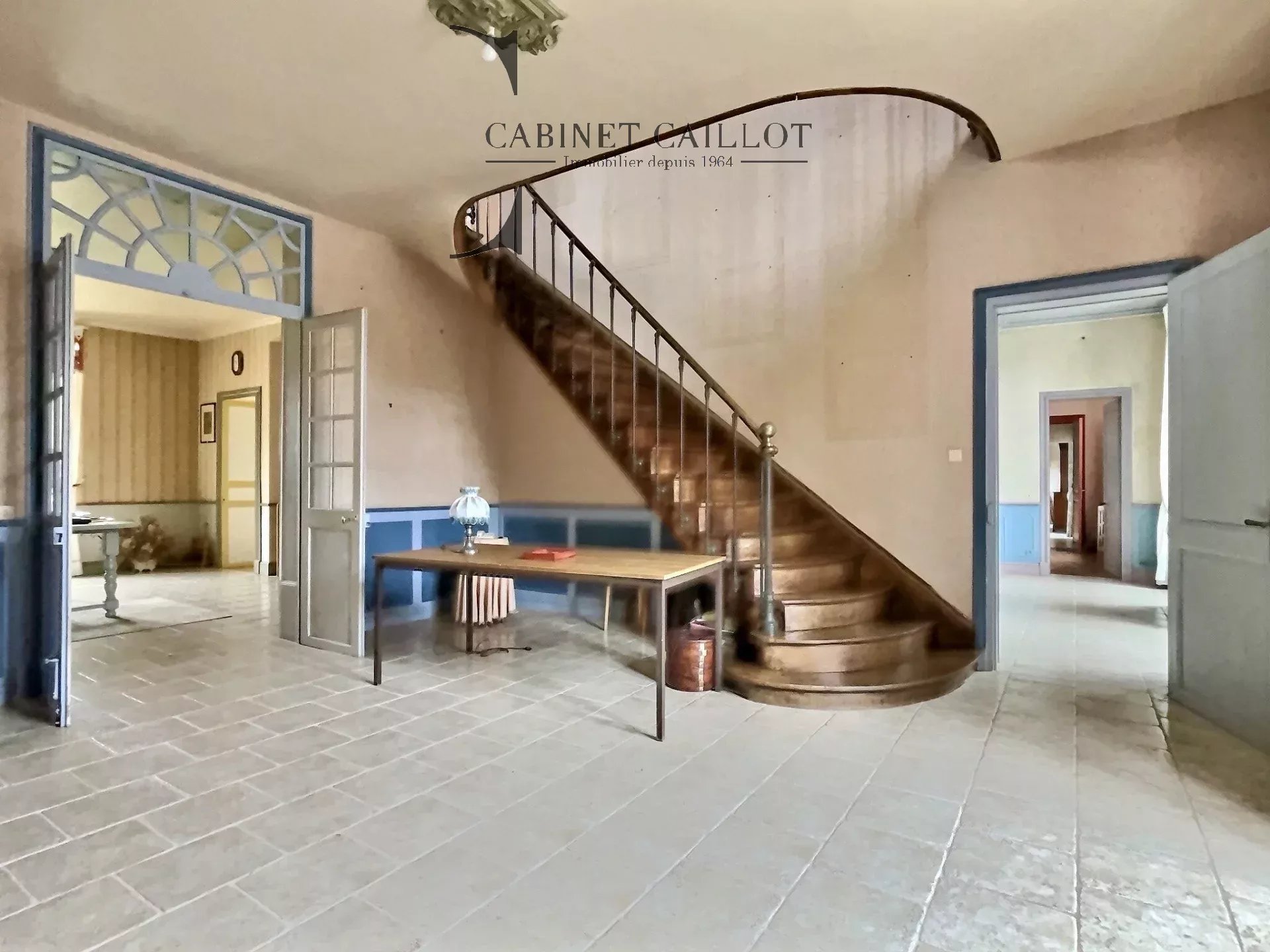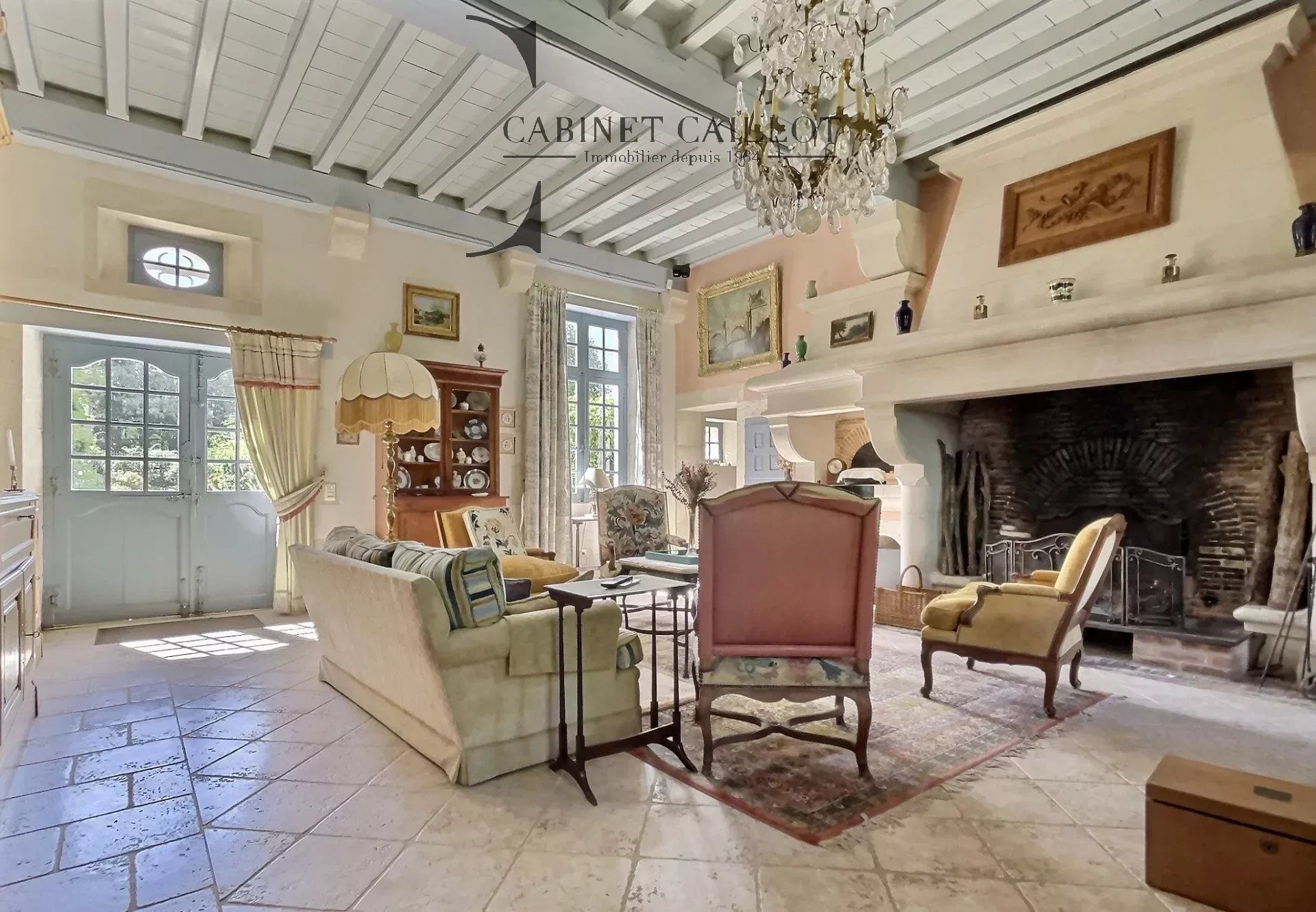 À l'étage : un grand salon traversant de 55 m² desservant 4 chambres, 2 salles d'eau et 1 salle de bain.