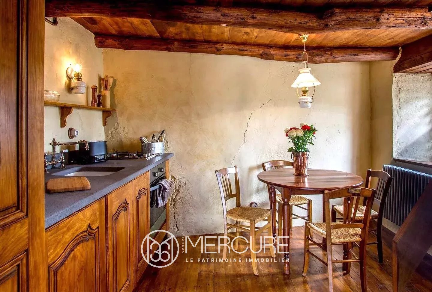 Au rez-de-chaussée se trouvent un salon accueillant avec des poutres apparentes et un espace chaleureux, idéal pour des moments de détente. La cuisine est lumineuse et bien agencée. Avec ses quatre pièces bien réparties, cette maison offre une atmosphère cosy et fonctionnelle, sublimée par une décoration authentique et rustique.