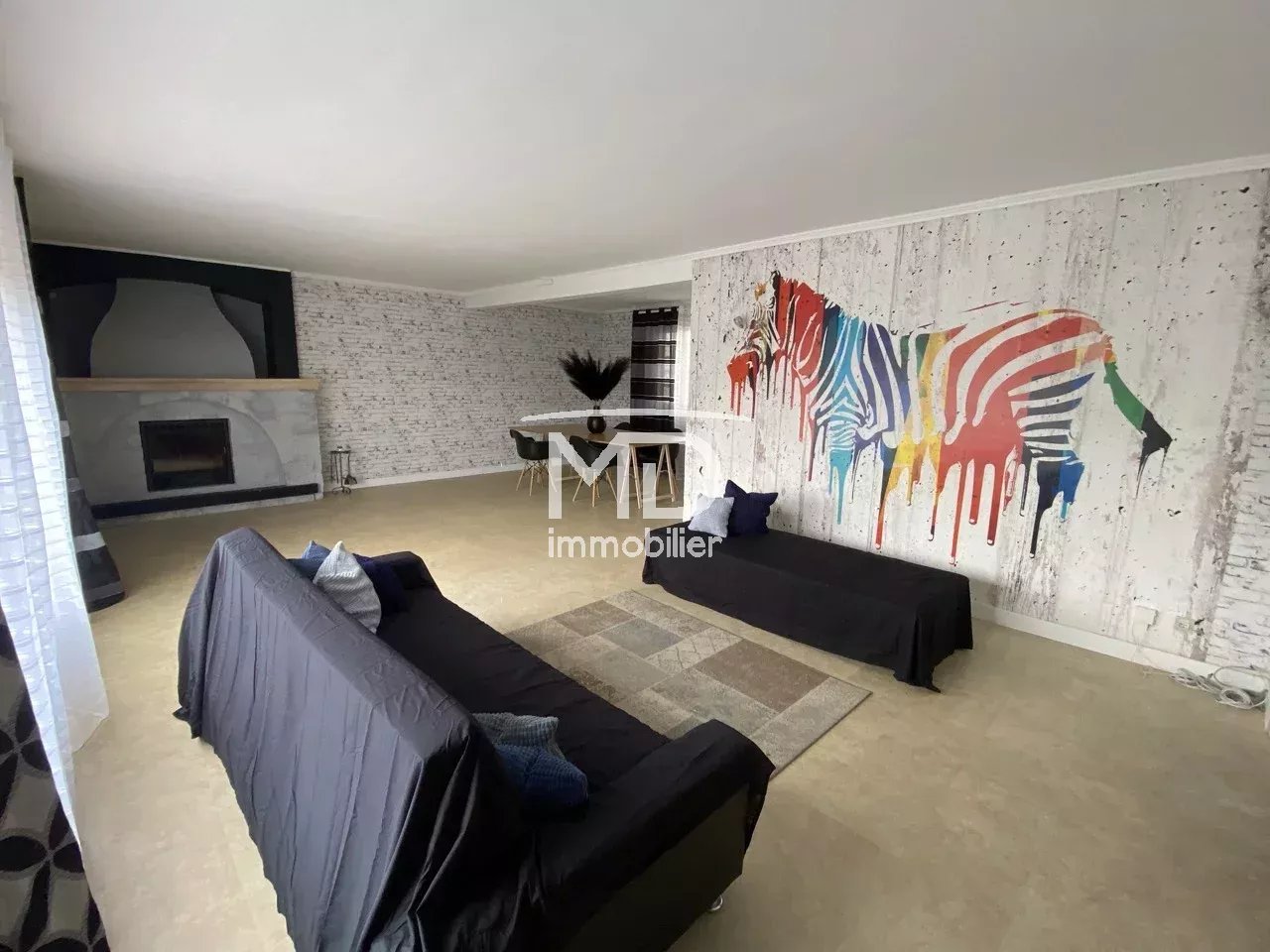 - Au rez-de-chaussée sur-élevé : entrée, double séjour de 43m² avec cheminée insert et grandes baies vitrées sur terrasse, couloir desservant une cuisine aménagée de 21m² avec espace repas, 4 chambres (9,5m², 14m², 15m², 20m²), une salle de bains, des WC séparés.