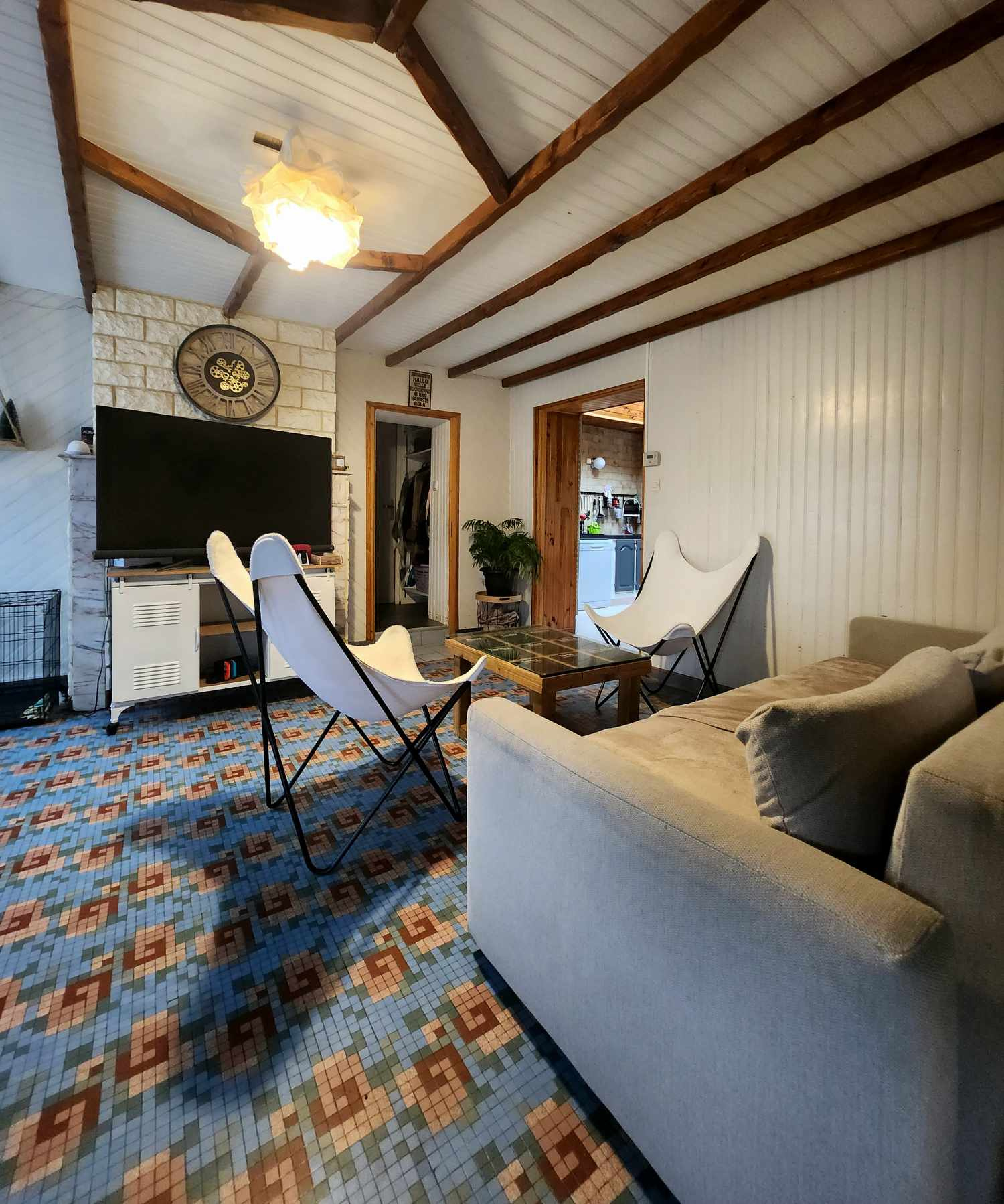 Au rez-de-chaussée, vous trouverez un salon chaleureux, une salle de bains, des WC séparés, une cuisine équipée, un séjour lumineux ainsi qu'un cellier pratique.