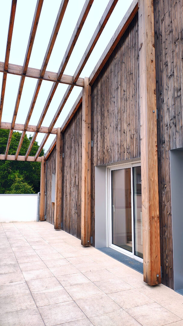 Terrasse plein ciel de 40 m², exposée pour profiter pleinement de la lumière naturelle et des vues dégagées sur la nature environnante