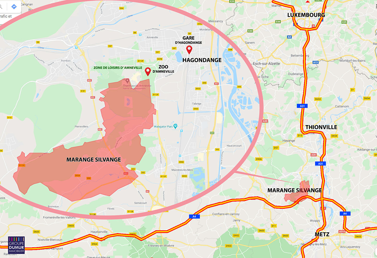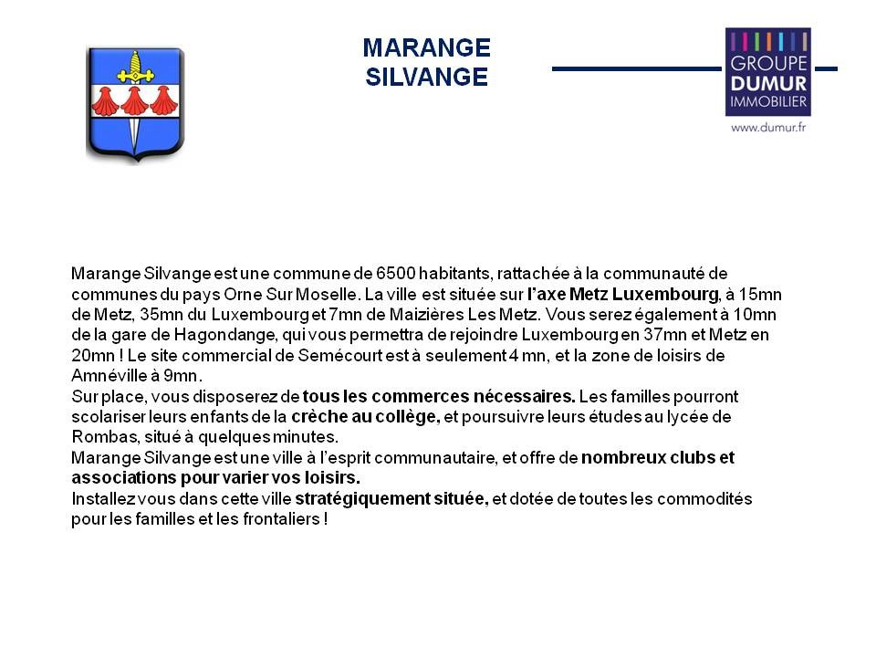 MARANGE-SILVANGE, commune située à 20mn de la gare d'Hagondange, proche des axes autoroutiers (A4 et A31), des commerces de la zone de Jailly, de Auchan Semécourt, de la zone Ecoparc à NORROY LE VENEUR et du futur hôpital Claude Bernard.