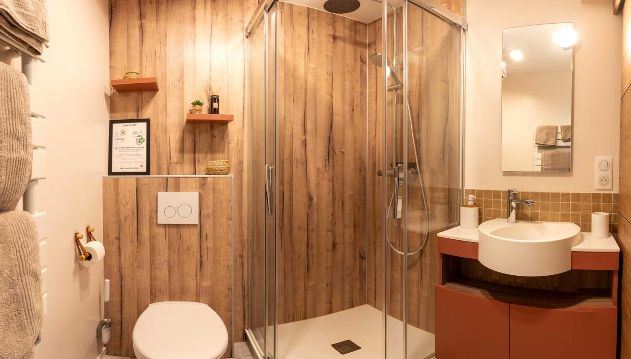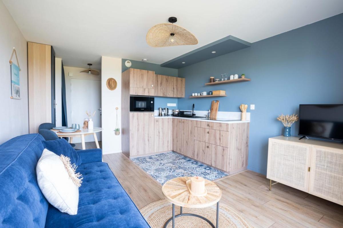 Au rez de chaussée, l'appartement se compose d'une entrée avec placard menant sur une belle pièce de vie lumineuse avec cuisine équipée et aménagée ouverte sur une terrasse et un jardin privatif vue mer. Une salle d'eau avec WC complète l'ensemble.