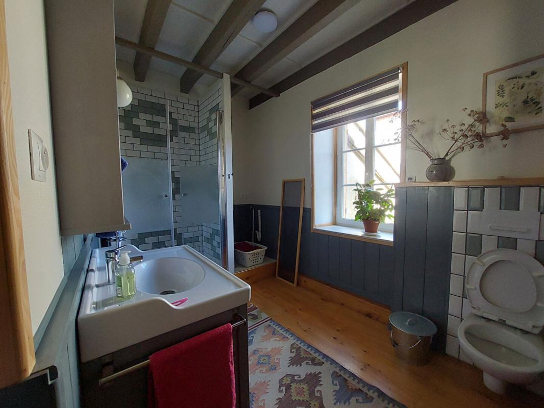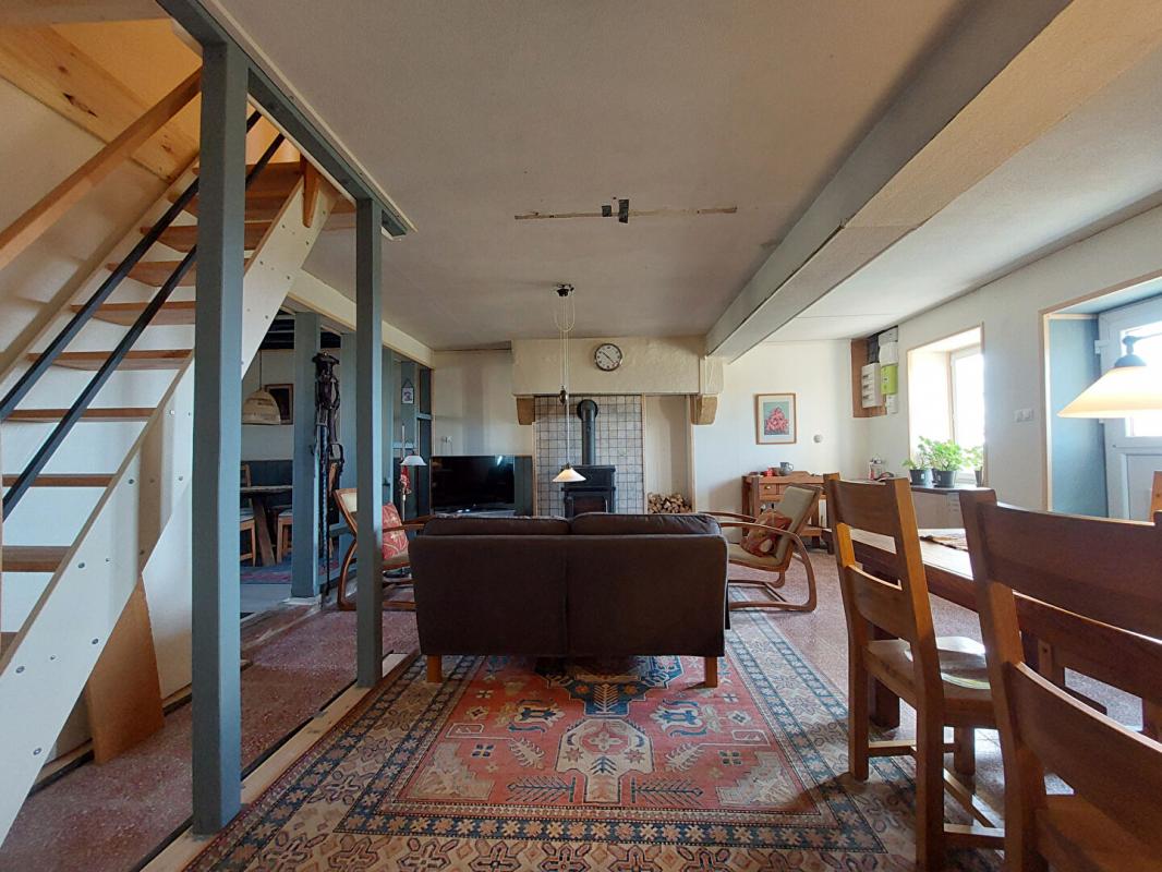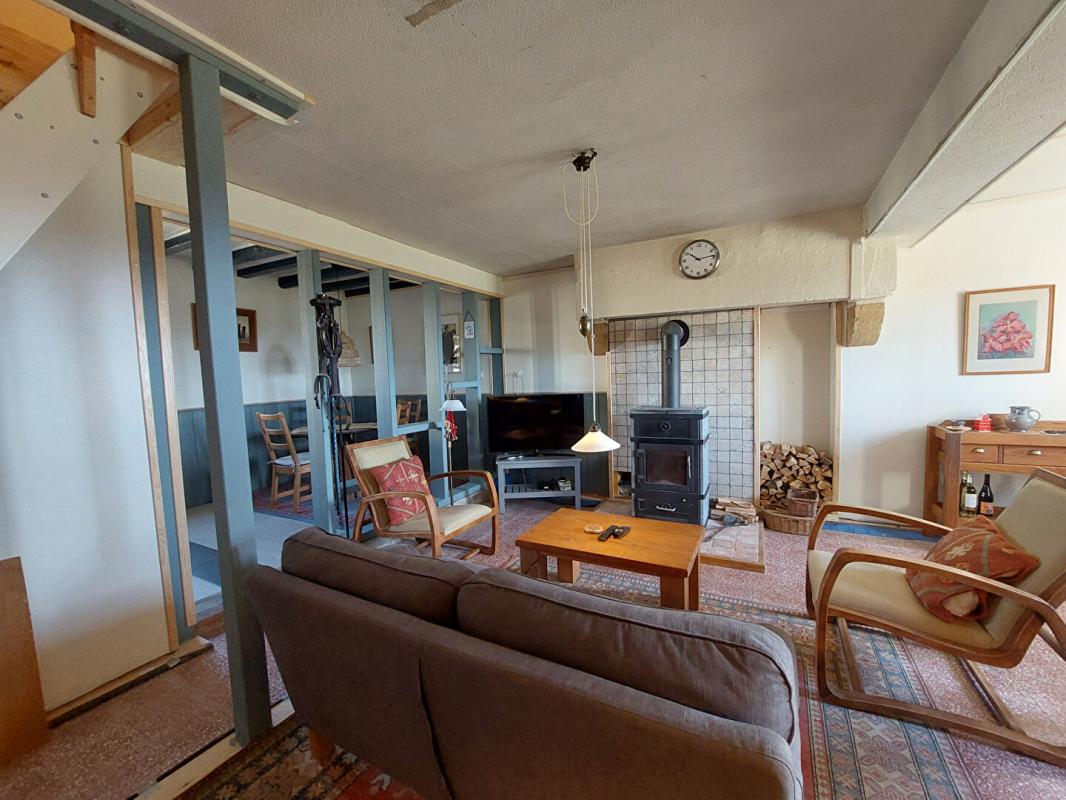 Au rez-de-chaussée, un séjour/salon avec poêle de masse, une cuisine semi-ouverte avec coin repas, une salle de bain avec WC, une chambre spacieuse.