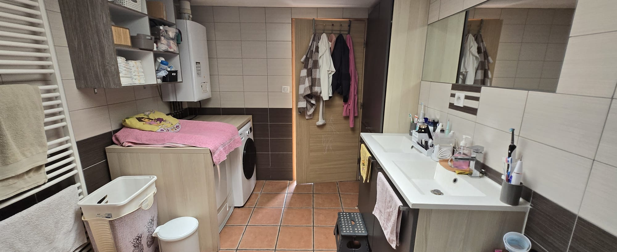Une entrée fonctionnelle, un WC séparé, une salle de bains spacieuse et évolutive, une belle cuisine équipée moderne en L ouverte sur les pièces de vie, une grande salle à manger chaleureuse, et un salon lumineux de près de 19 m2 avec accès direct à la terrasse.