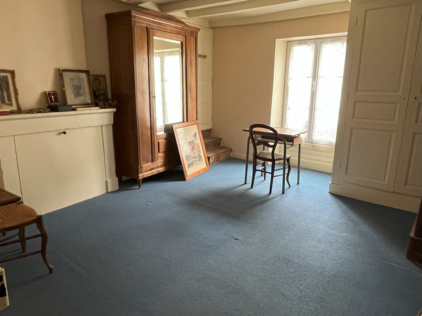 À l'étage : deux chambres, un WC séparé, ainsi qu'une pièce supplémentaire menant à un grenier aménageable. Huisseries et radiateurs électriques récemment remplacés.