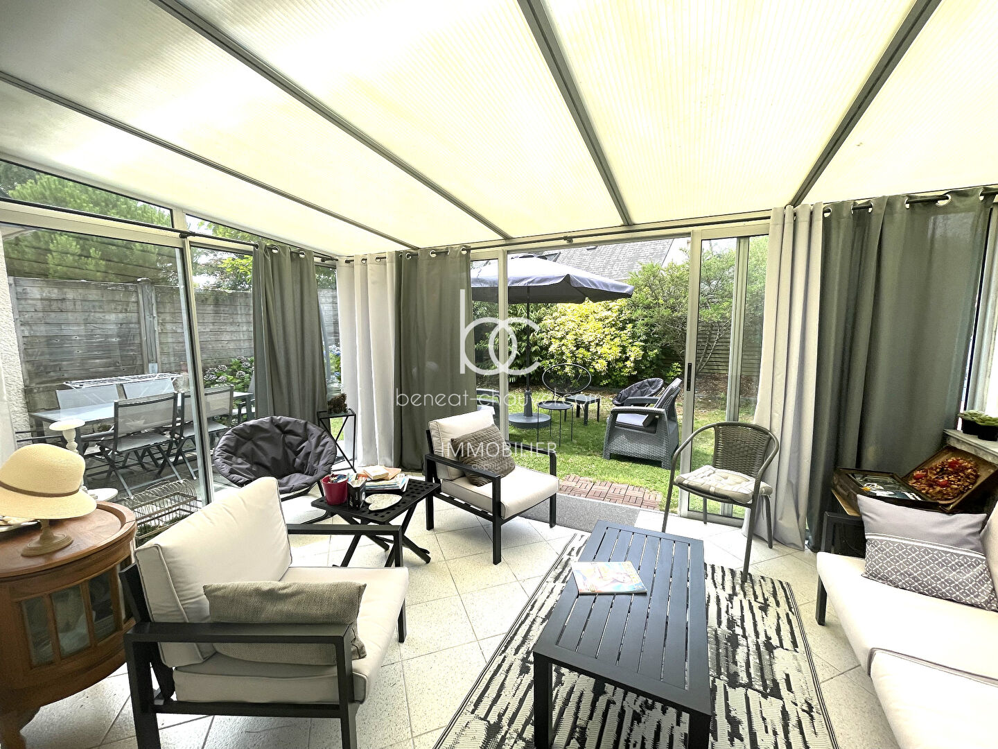 Le salon s'ouvre sur une véranda spacieuse, véritable pièce de vie supplémentaire, idéale toute l'année.