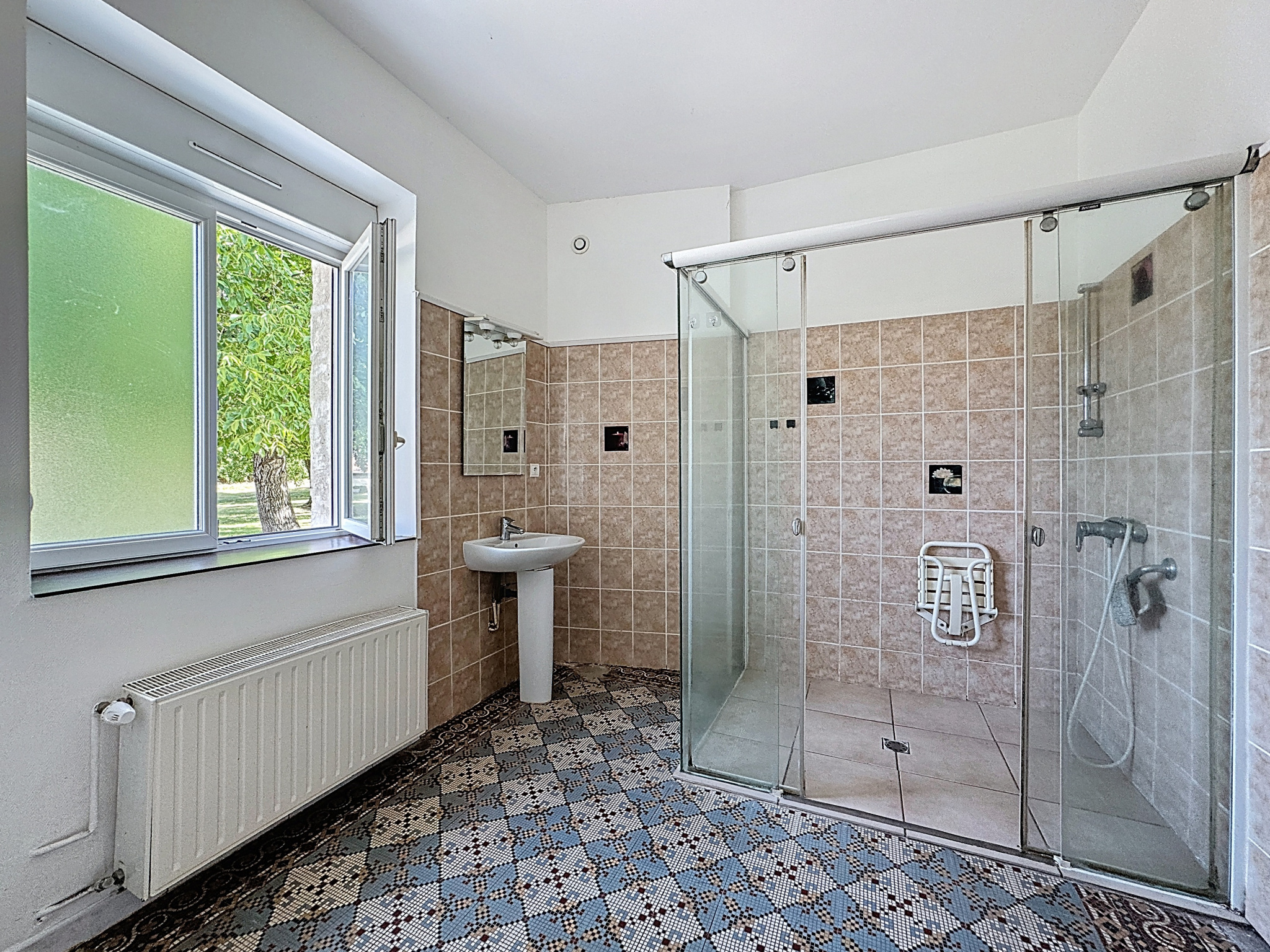 -Au rez-de-chaussée d'une entrée, d'une cuisine à aménager, d'une salle à manger (34m2), d'un salon (24m2), d'une chambre, d'une salle de douches et de WC.