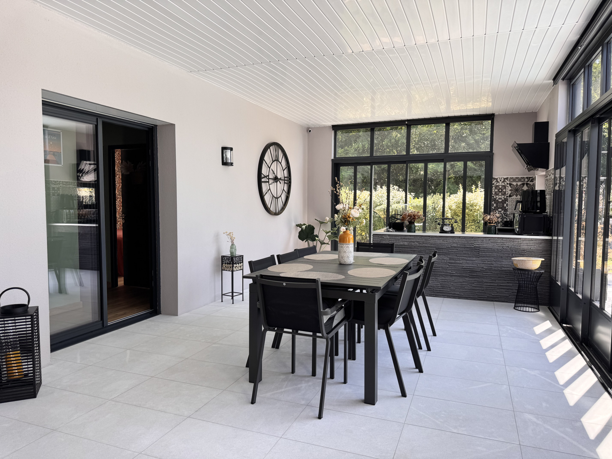 Une grande véranda lumineuse prolonge l'espace de vie et s'ouvre sur un jardin paysagé sans vis-à-vis, en lisière de forêt. Pour votre confort, la maison est équipée d'un chauffage au sol et de panneaux solaires garantissant une excellente performance énergétique.