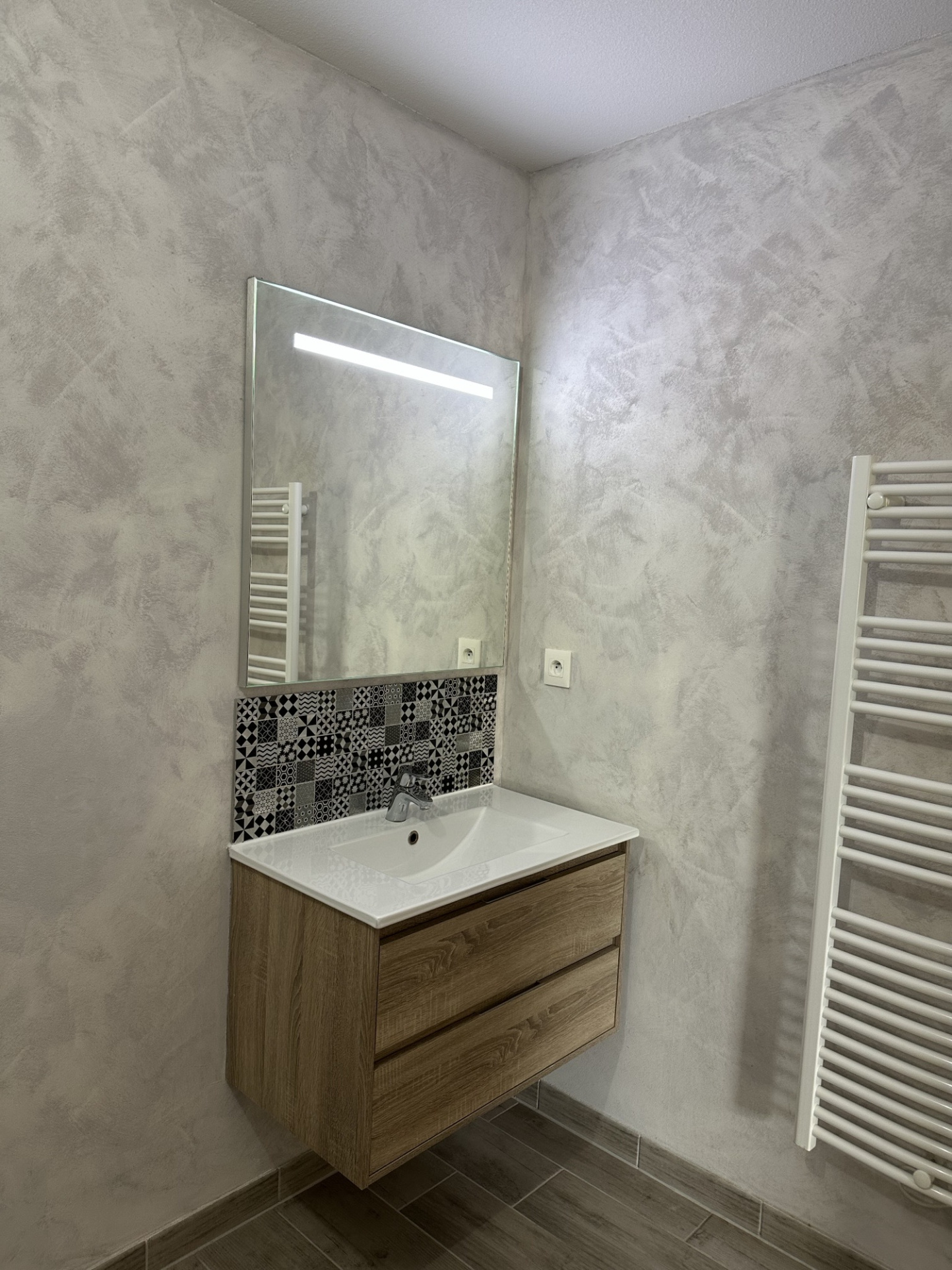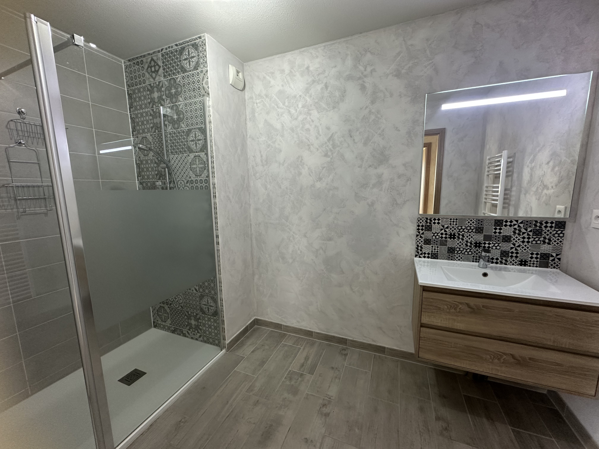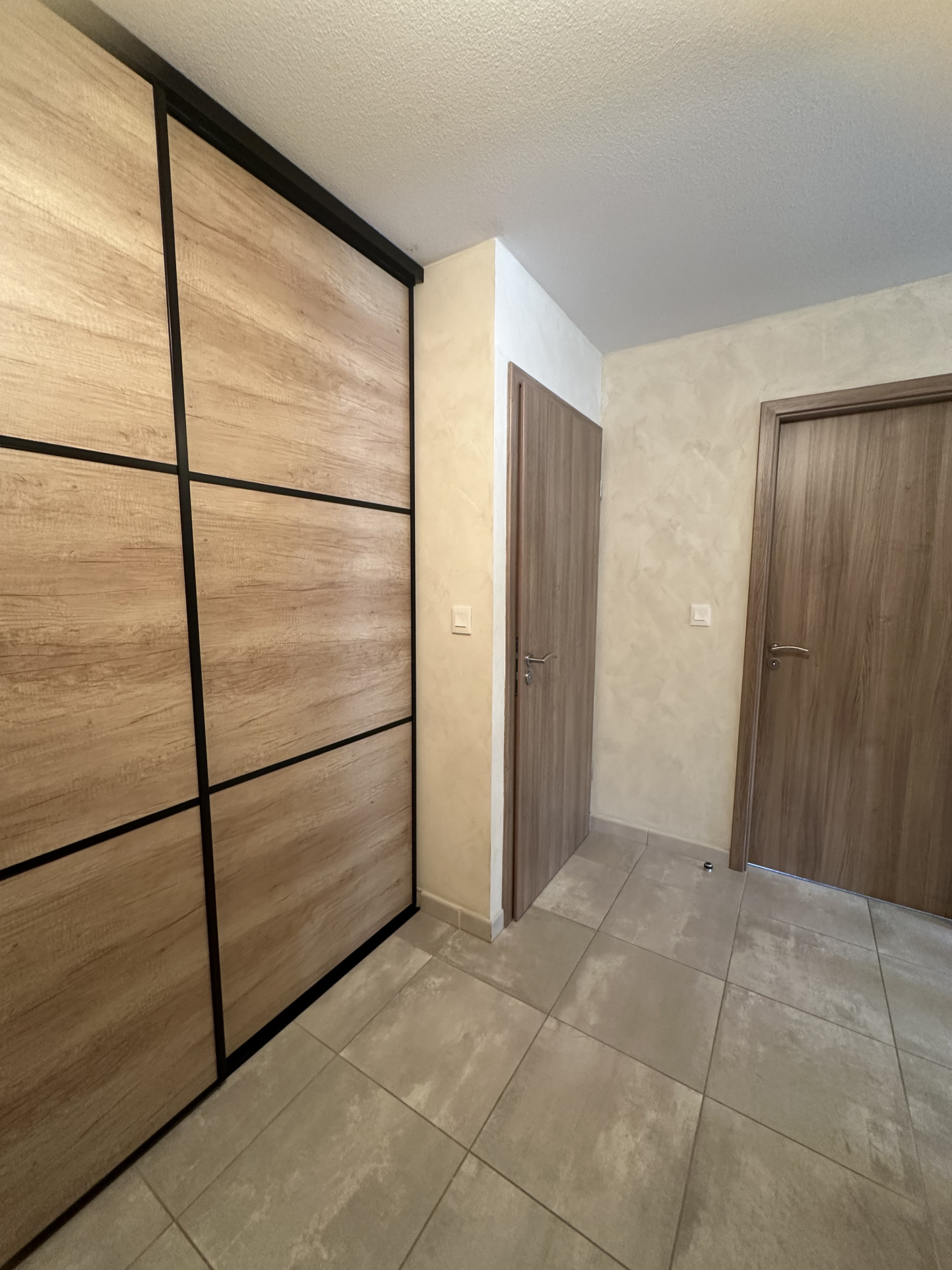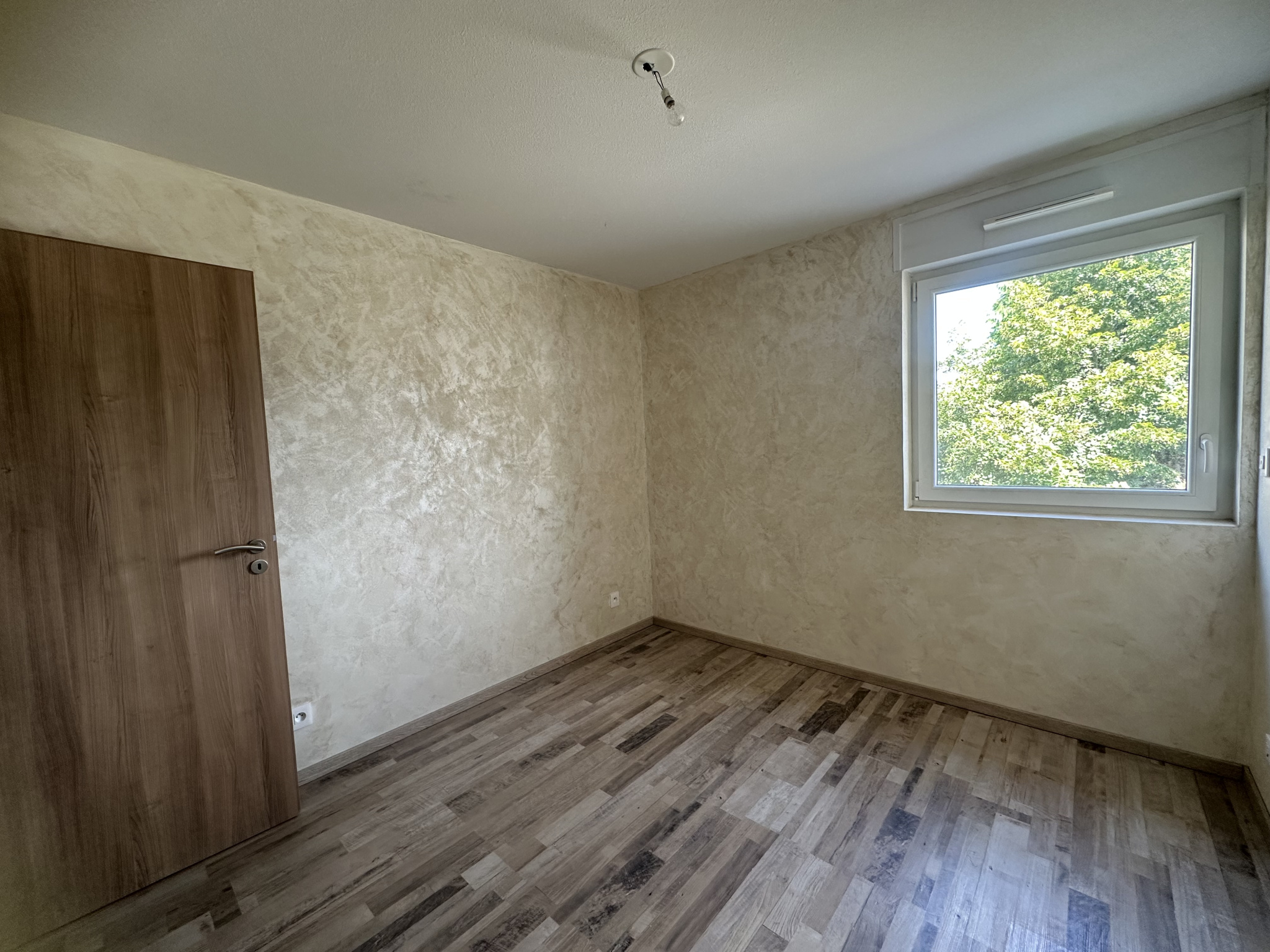 Il se compose d'une entrée avec placards, une pièce de vie lumineuse avec cuisine équipée récente, deux belles chambres, une salle d'eau impeccable et un toilette séparé.