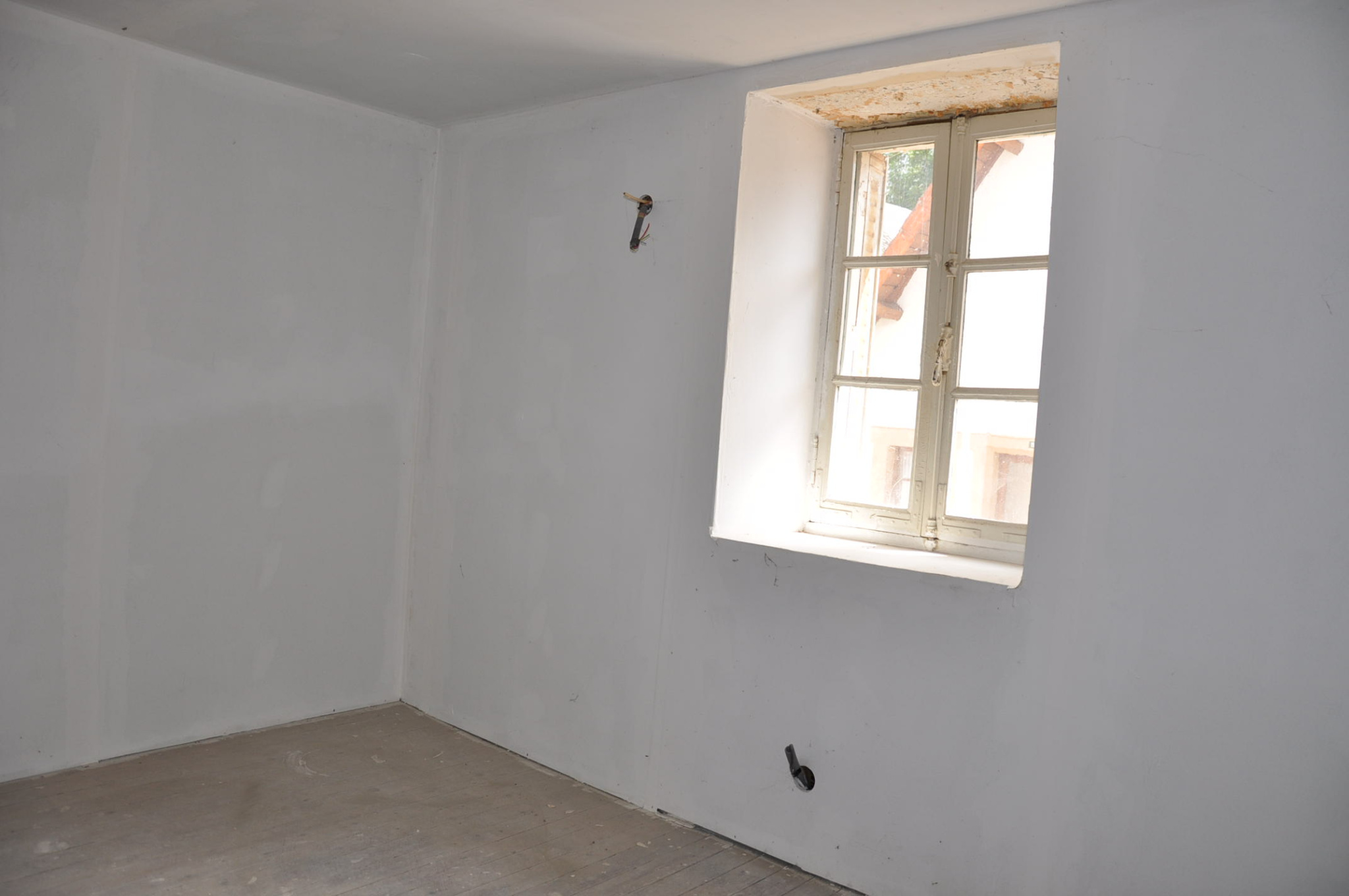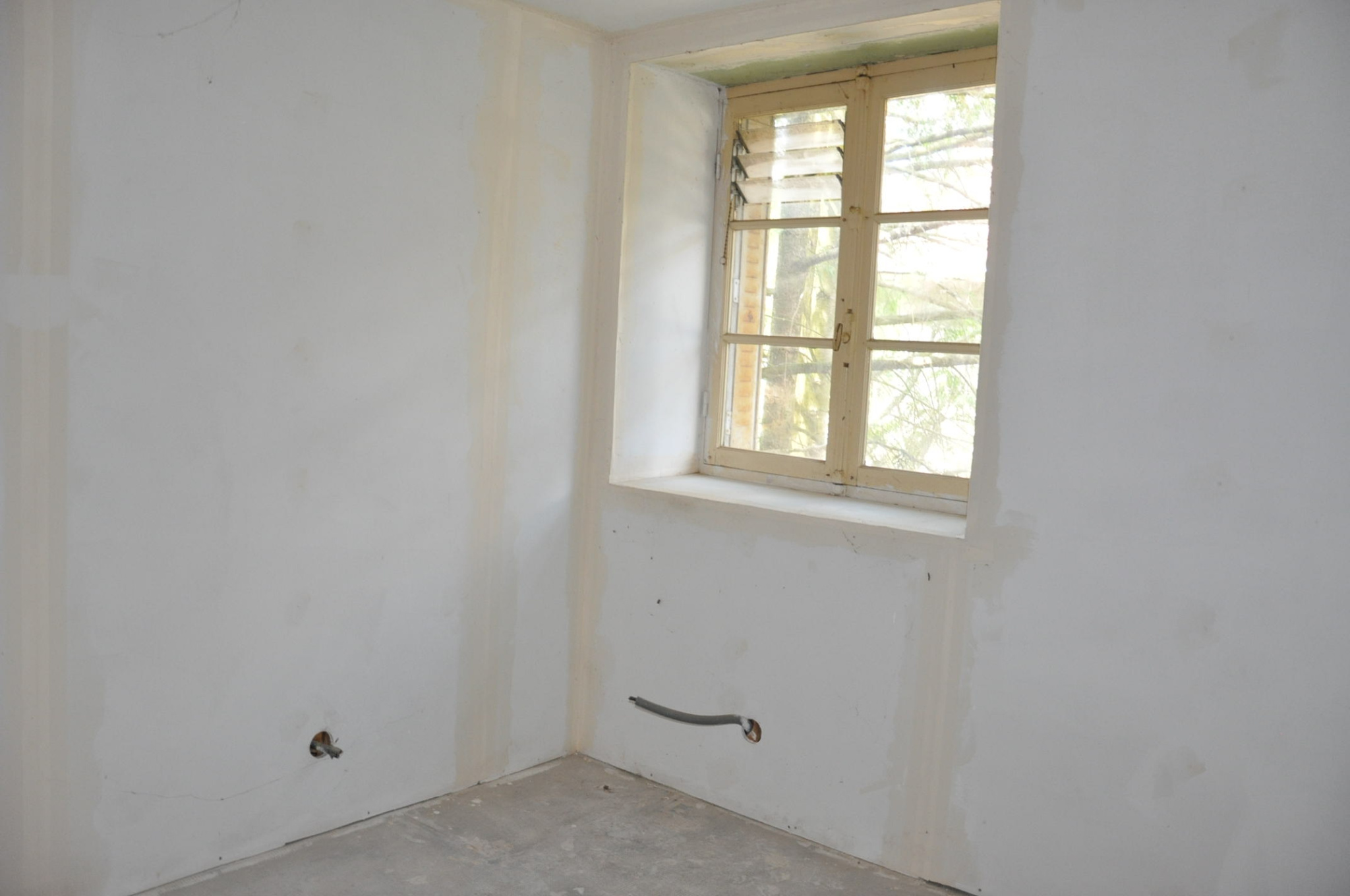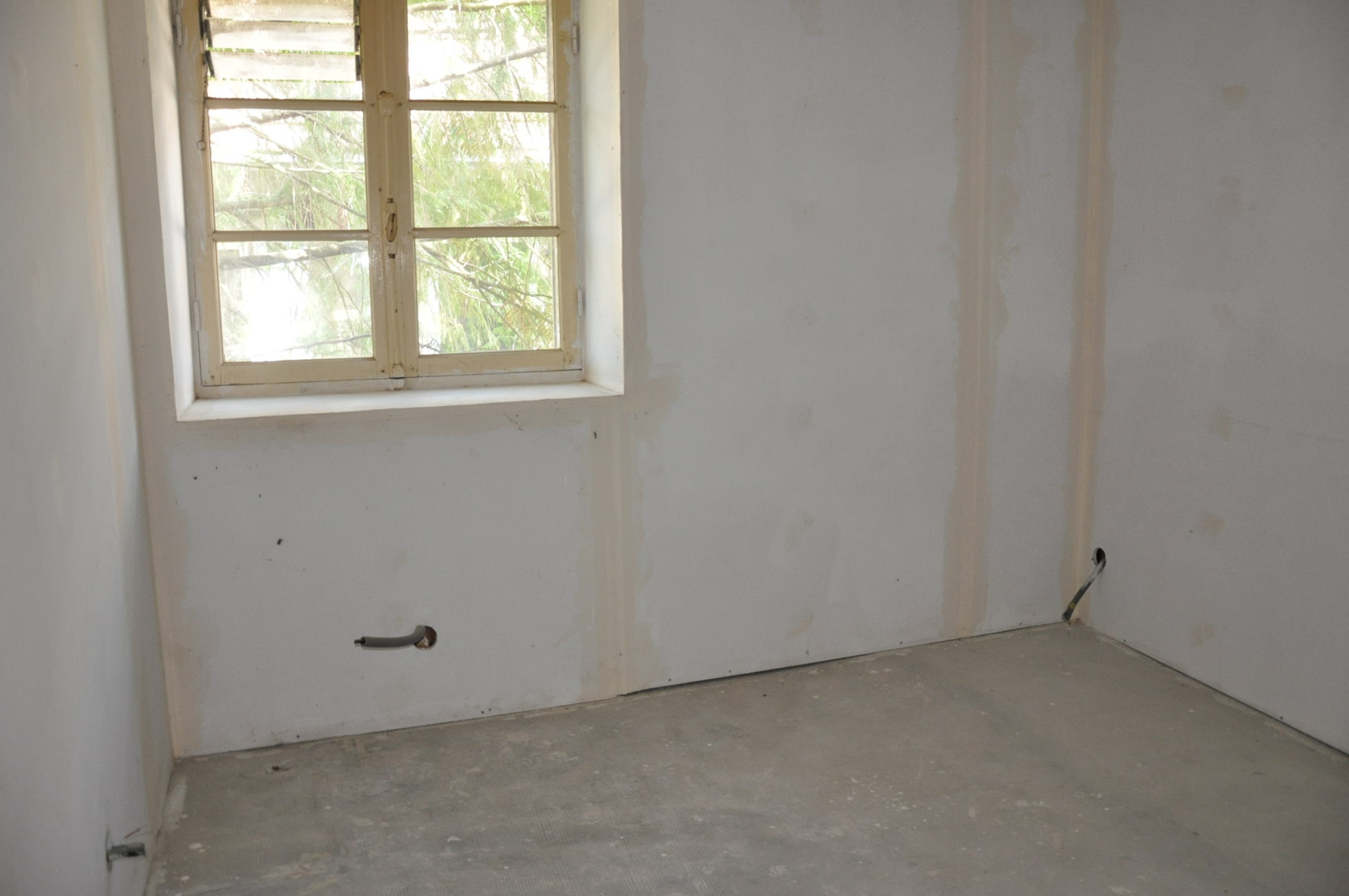Petite courette à l'arrière. Les travaux ont été partiellement commencés mais non terminés (isolation, électricité, plomberie...). Pas de systéme de chauffage.