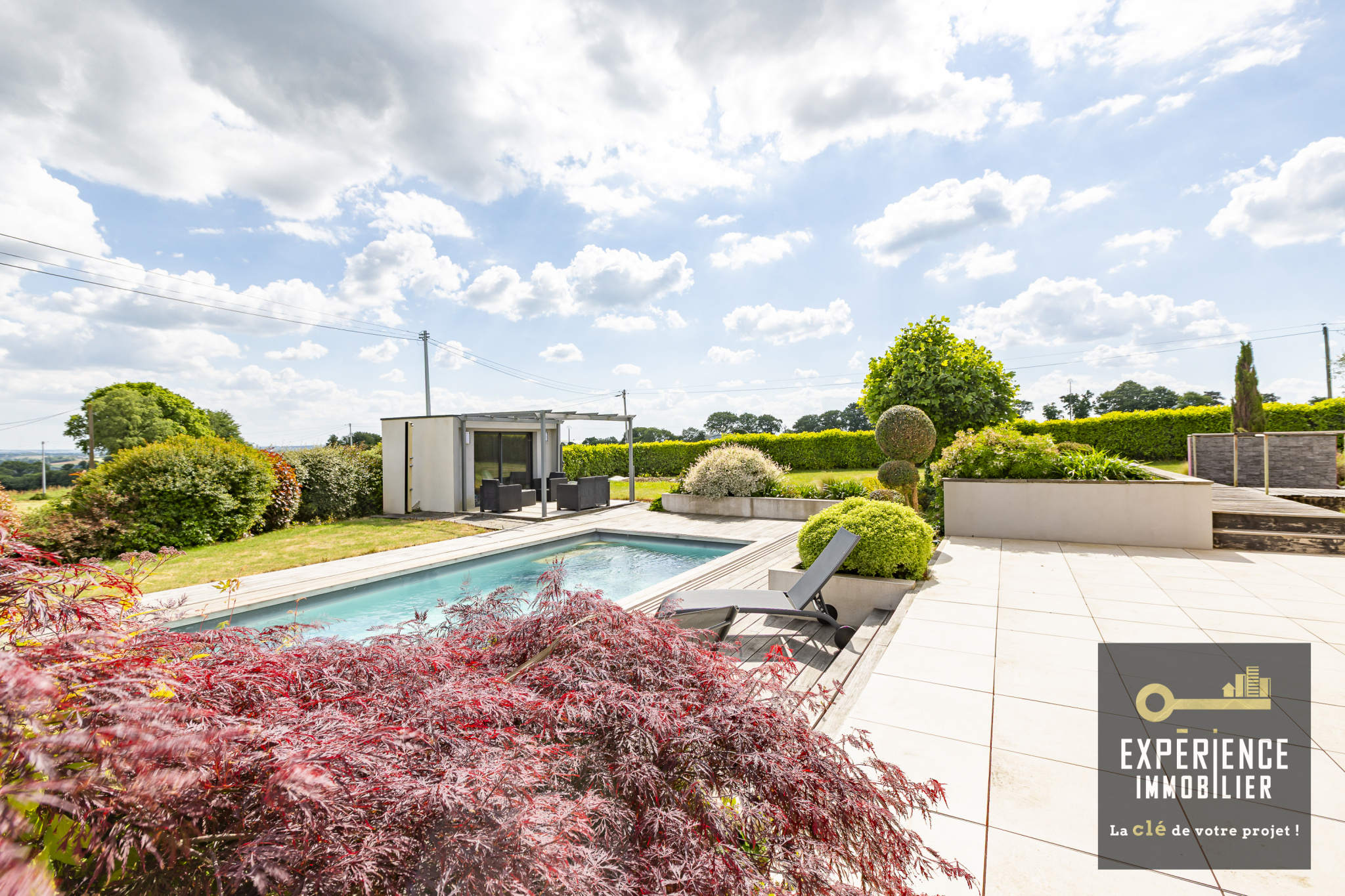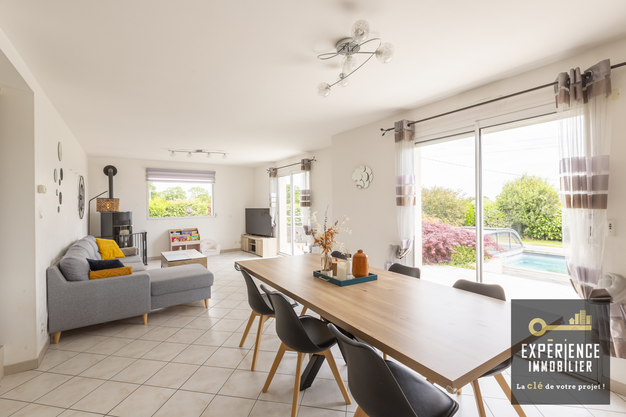 Découvrez cette belle maison de style contemporain offrant 135 m2 de surface habitable, édifiée sur un terrain paysagé de 2300 m2, un véritable havre de paix. Dès votre arrivée, vous serez accueillis par une entrée chaleureuse qui mène à une pièce de vie baignée de lumière naturelle, équipée d'un poêle à granulés. Cette pièce s'ouvre sur une terrasse conviviale avec un accès direct à une piscine couverte et chauffée, idéale pour se détendre en toute saison. La cuisine aménagée et équipée est ouverte sur l'espace de vie, créant ainsi un espace agréable idéal pour recevoir. La maison comprend cinq chambres, dont une chambre et une salle d'eau au rez-de-chaussée, permettant une vie de plain-pied idéale pour tous. Une arrière-cuisine/buanderie et un bureau s'ajoutent au confort de la maison. Un double garage complète ce bien, offrant un espace de stationnement sécurisé. Ses atouts : le système de chauffage de la maison est idéal grâce à une pompe à chaleur géothermie qui alimente les planchers chauffants du rez-de-chaussée et de l'étage avec le confort supplémentaire du poêle à granulés, la piscine est chauffée via une pompe à chaleur aérothermie, des panneaux solaires ont été installés pour la revente d'électricité...