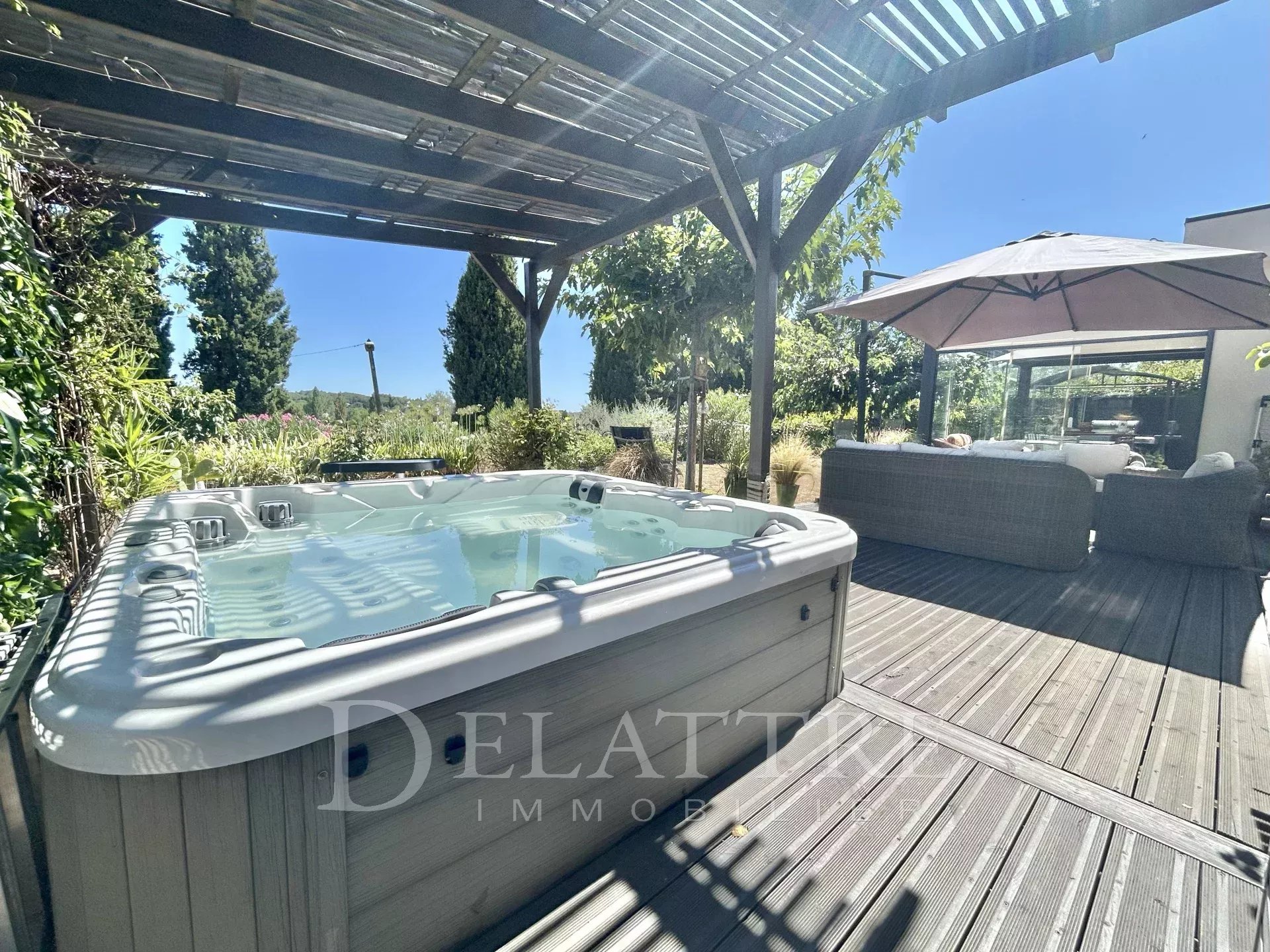 Au coeur d'un jardin méditerranéen plein sud avec vue sur le golf,superbe villa individuelle contemporaine de 2019 baignée de soleil,à proximité immédiate des écoles,arrêts de bus et commerces.