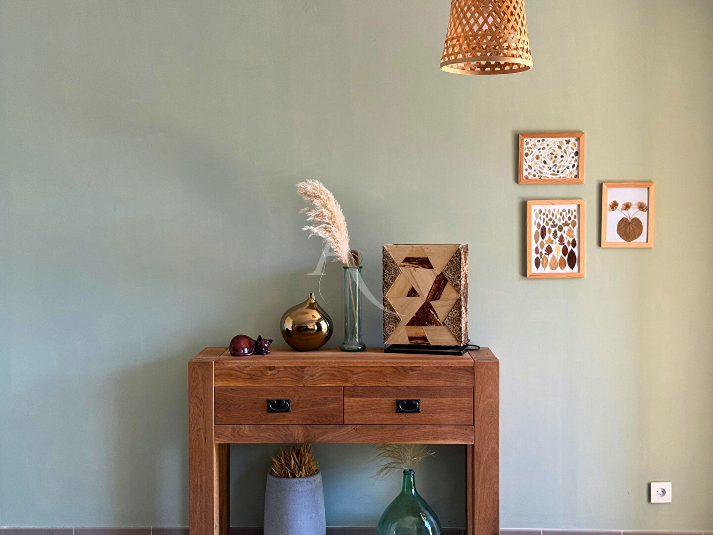 L'entrée s'ouvre sur un vaste séjour traversant, lumineux et climatisé, donnant accès à une première terrasse de 15 m² et un jardin intimiste. La cuisine américaine, entièrement meublée et équipée, s'intègre parfaitement à l'espace de vie.