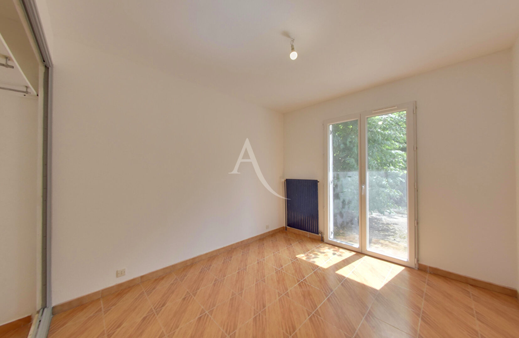 L'entrée dessert un grand salon-séjour lumineux avec cheminée et accès terrasse, cuisine indépendante, deux chambres dont une avec accès terrasse, salle de bains, wc.