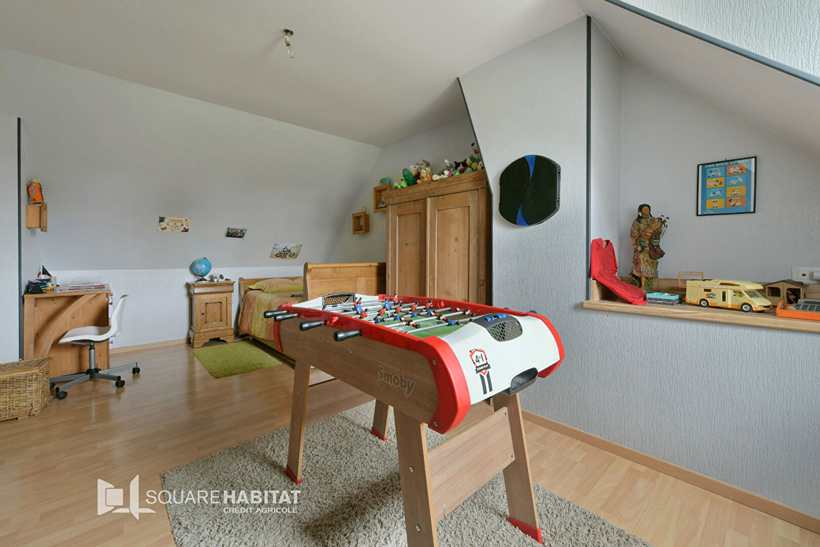 Garage attenant avec un bureau et une pièce aménagée au-dessus.