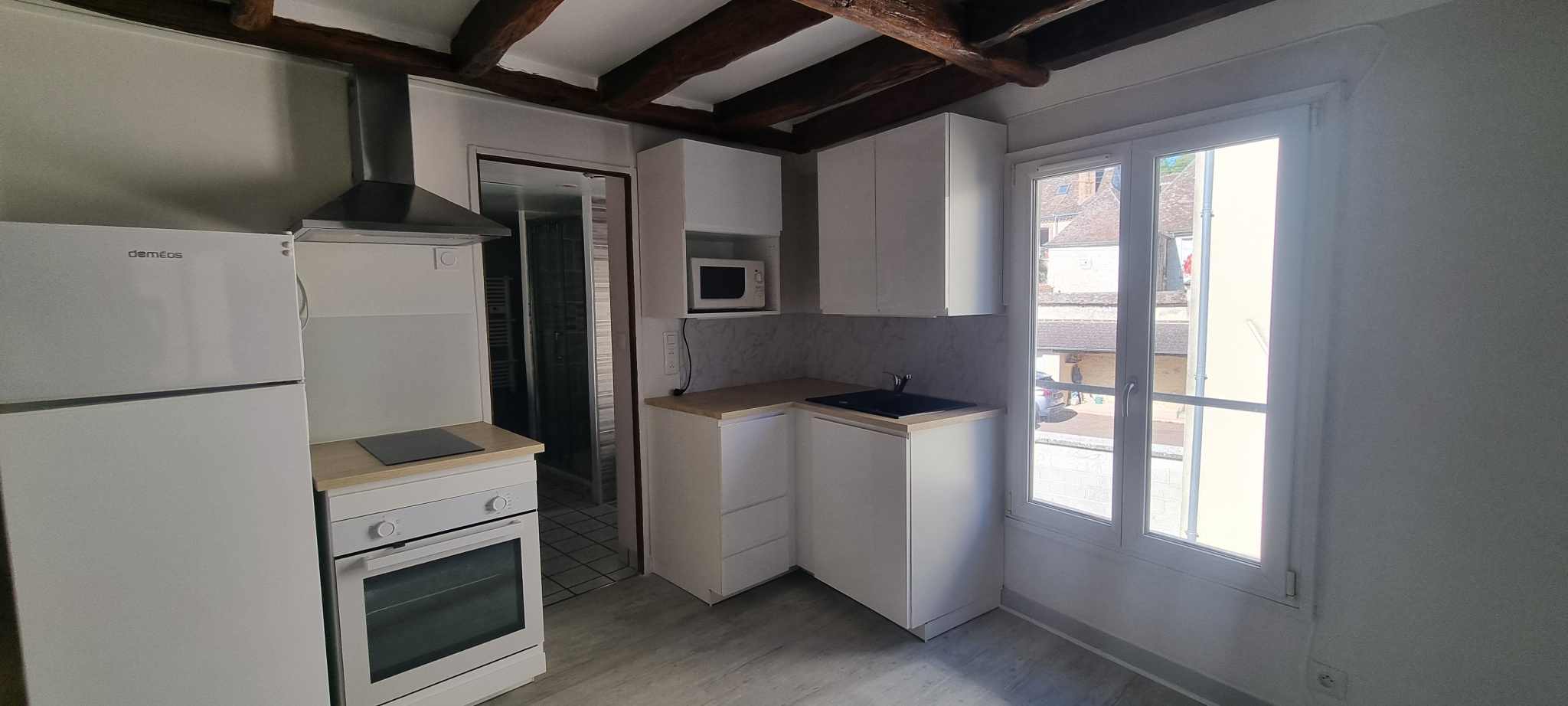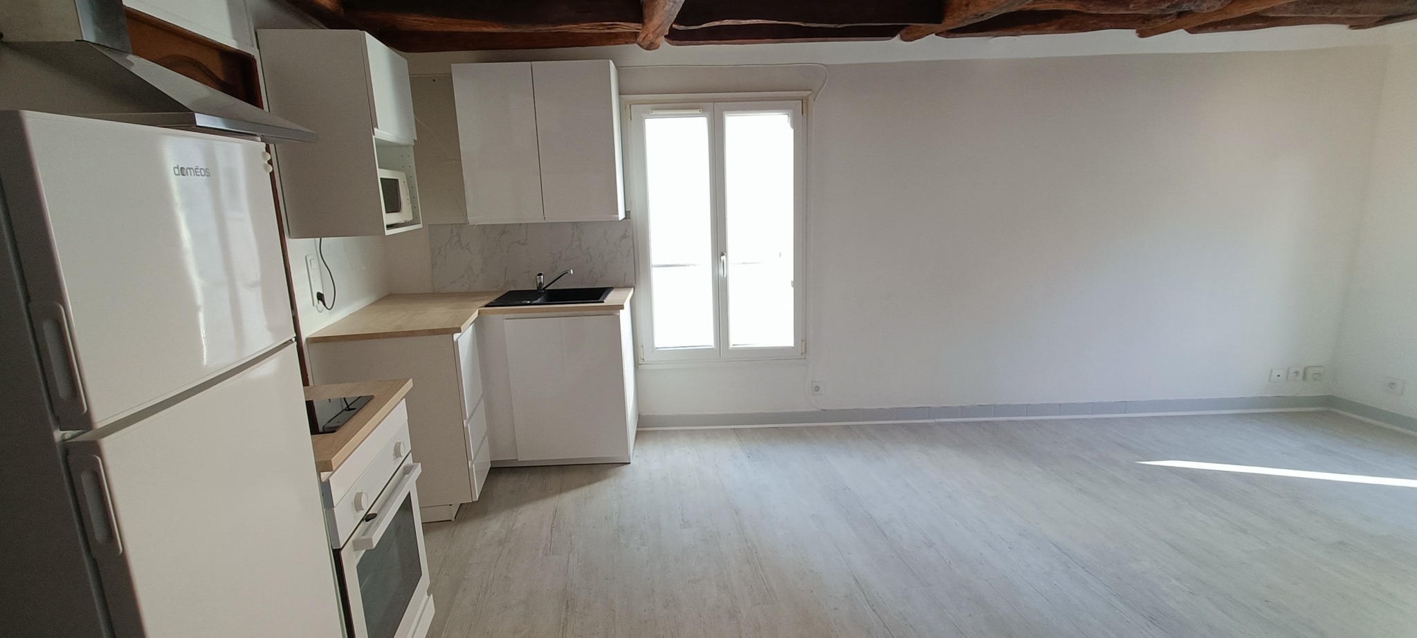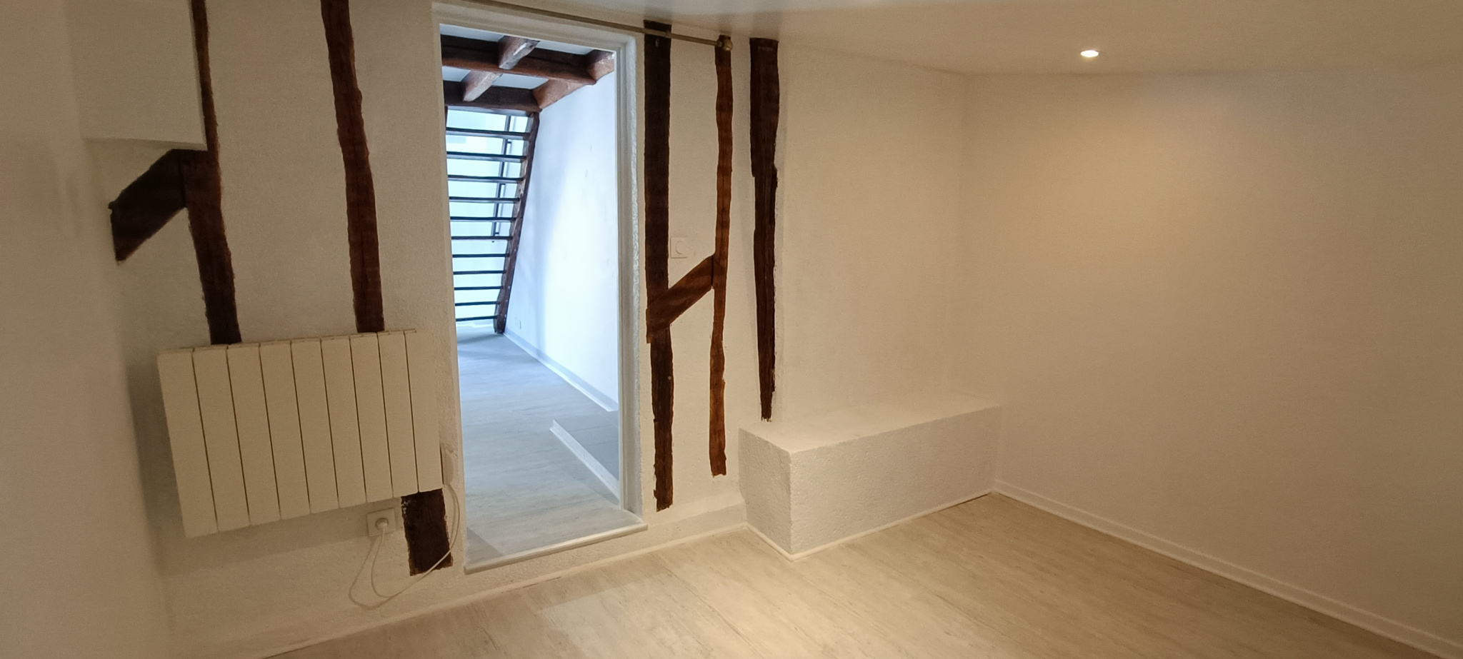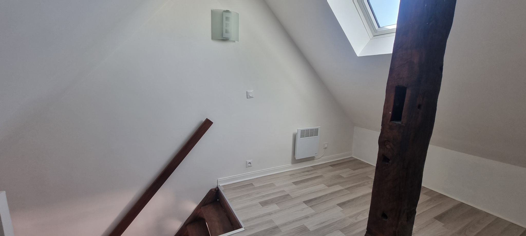 Cet appartement comprend : séjour ouvert sur cuisine aménagée, salle d'eau avec WC, bureau, et chambre mansardée à l'étage.