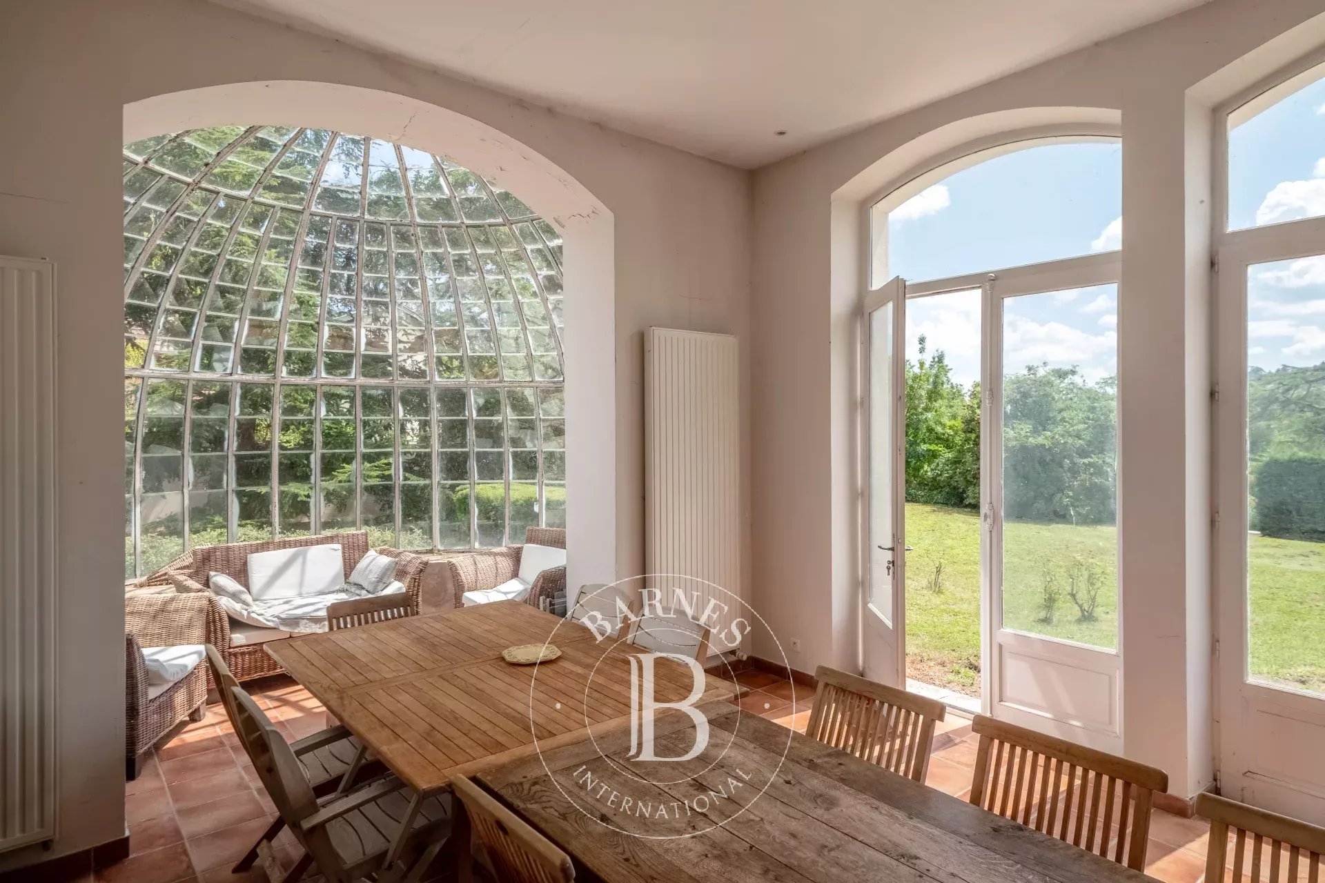Dès l’entrée, un vaste hall donne le ton et dessert plusieurs salons de réception, une cuisine spacieuse et une verrière baignée de lumière, véritable cœur de la maison.