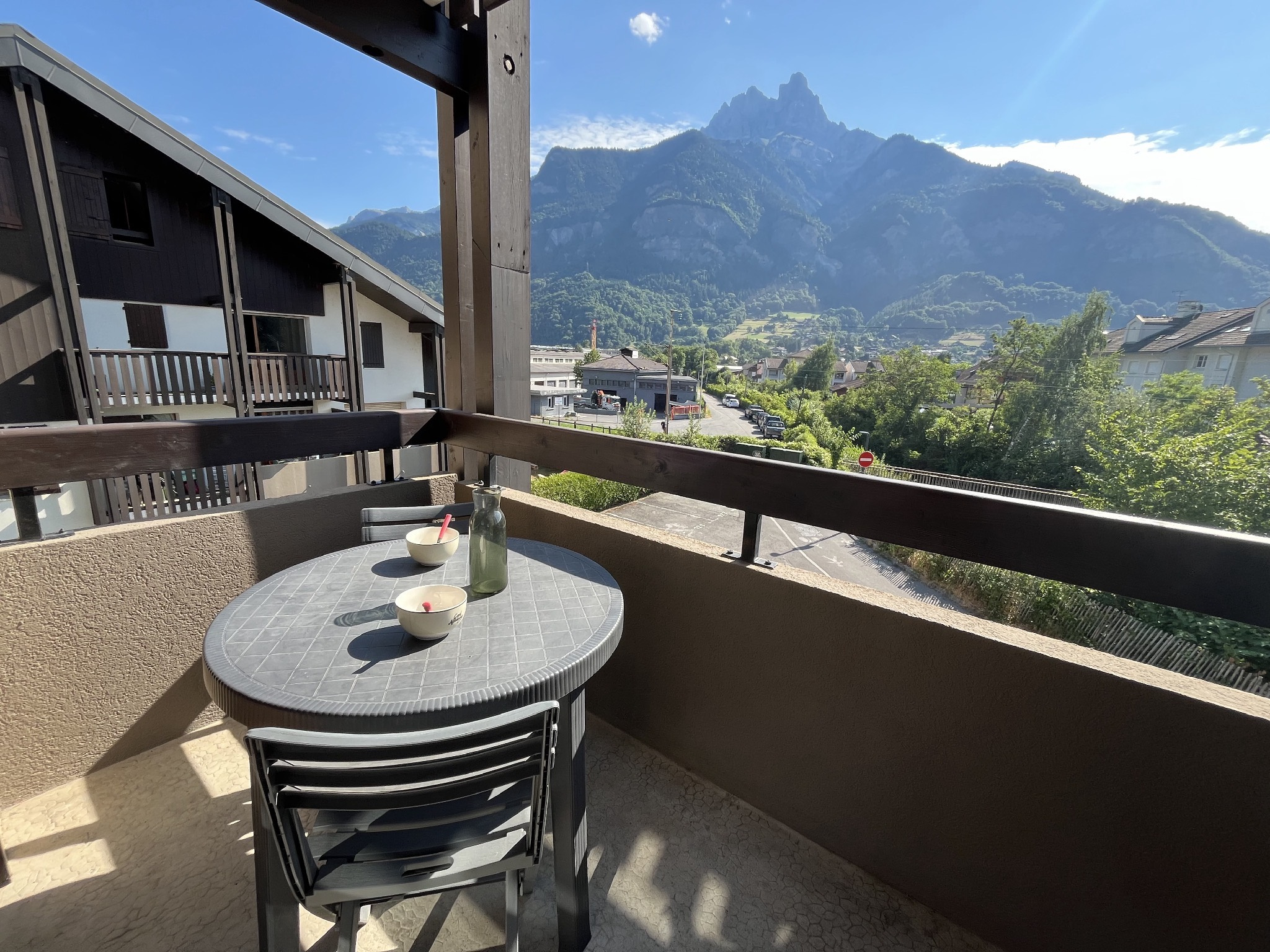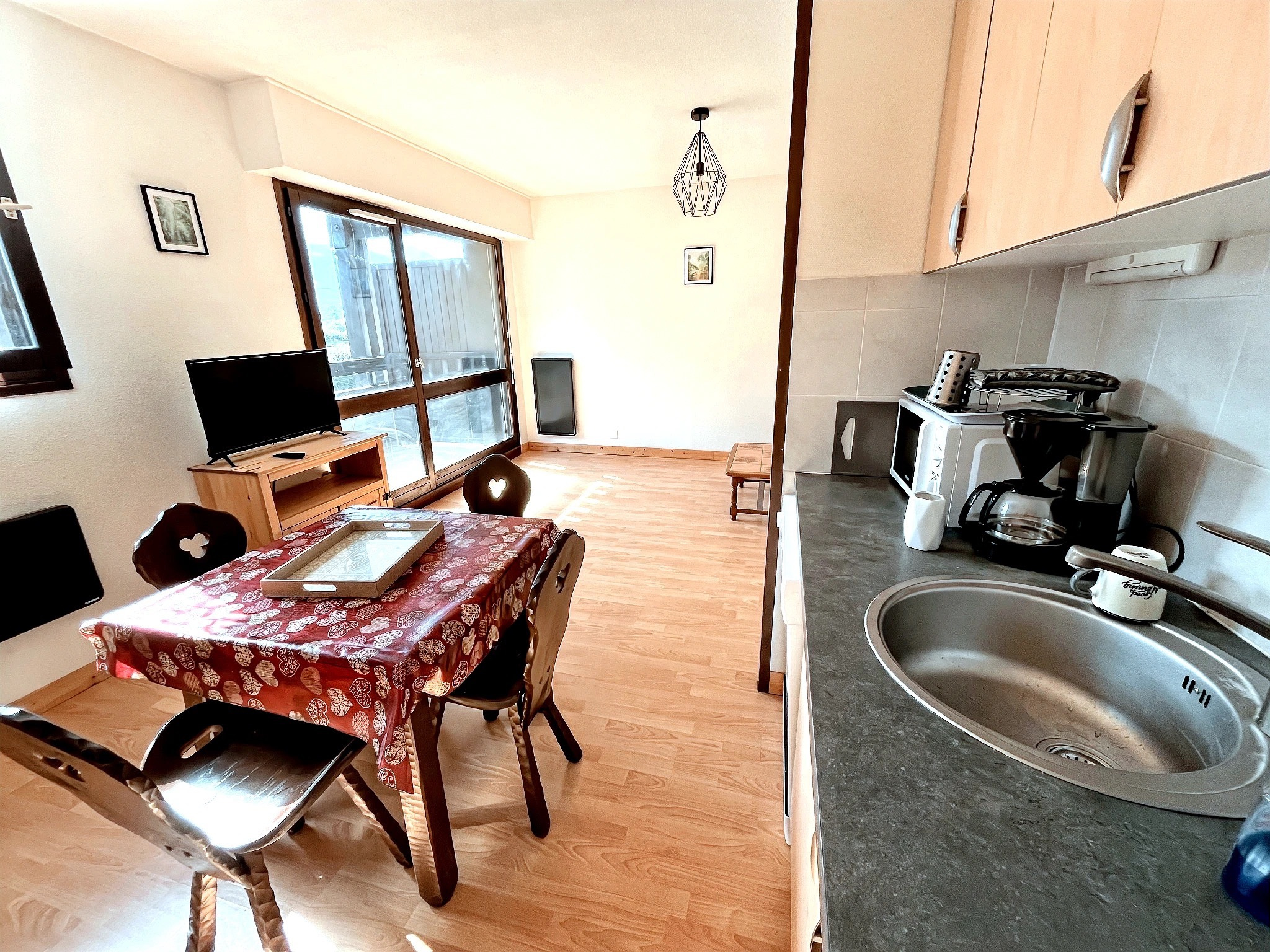 Studio avec terrasse Est-Sud, en très bon état général, comprenant une entrée, un dressing, une salle d'eau avec emplacement machine à laver, douche, et Wc, une grande pièce de vie avec cuisine ouverte et accès à la terrasse, sans vis à vis, avec vue Fiz et Mont-Blanc.