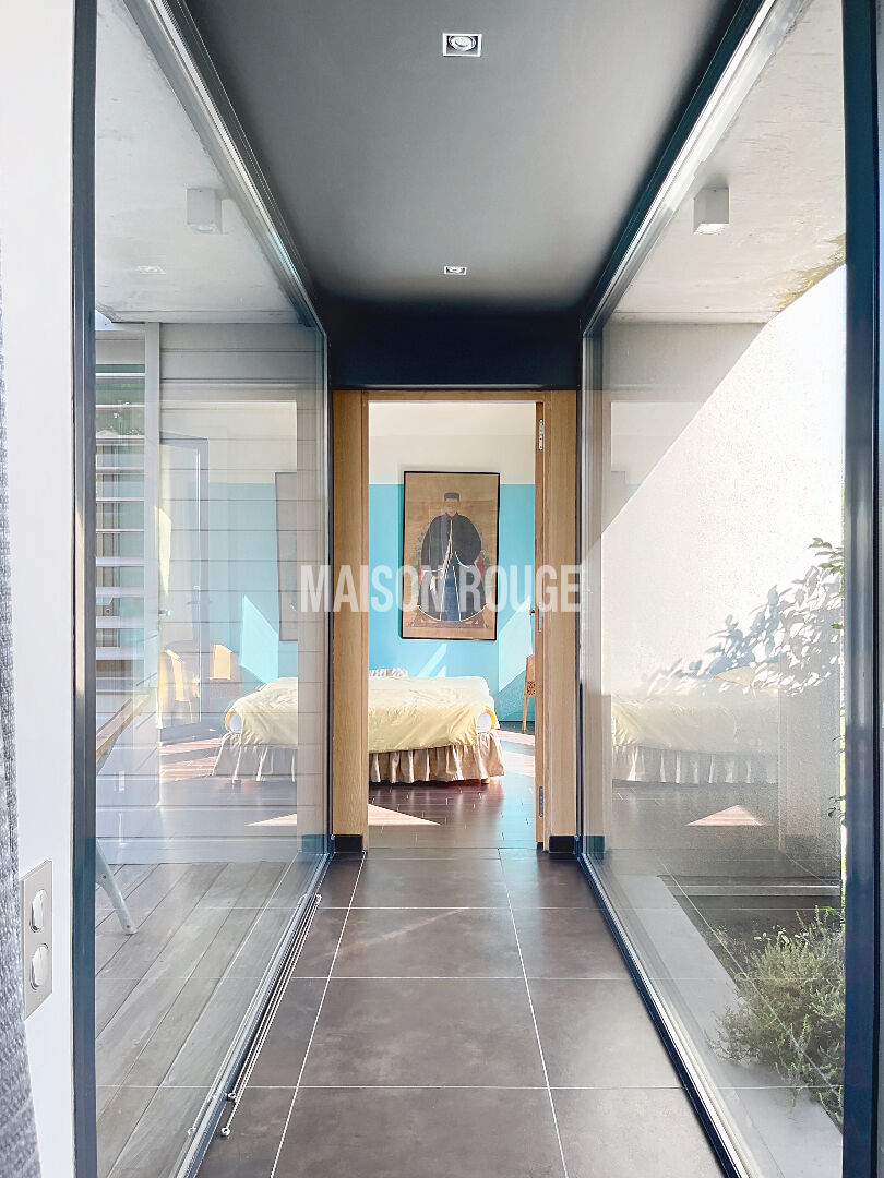 Baignée de lumière grâce à ses nombreuses baies vitrées, elle offre un grand séjour avec salle à manger et cuisine aménagée et équipée, l'ensemble ouvert sur la terrasse et la piscine.