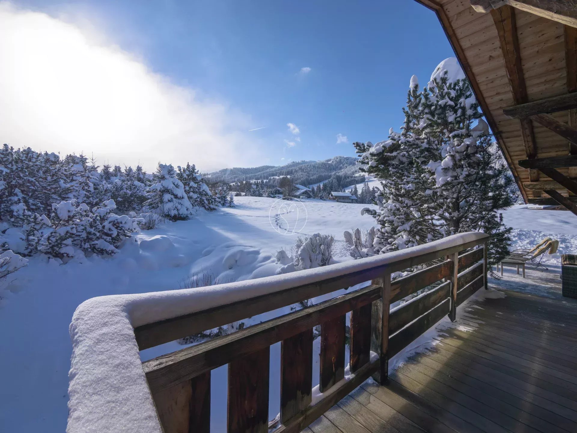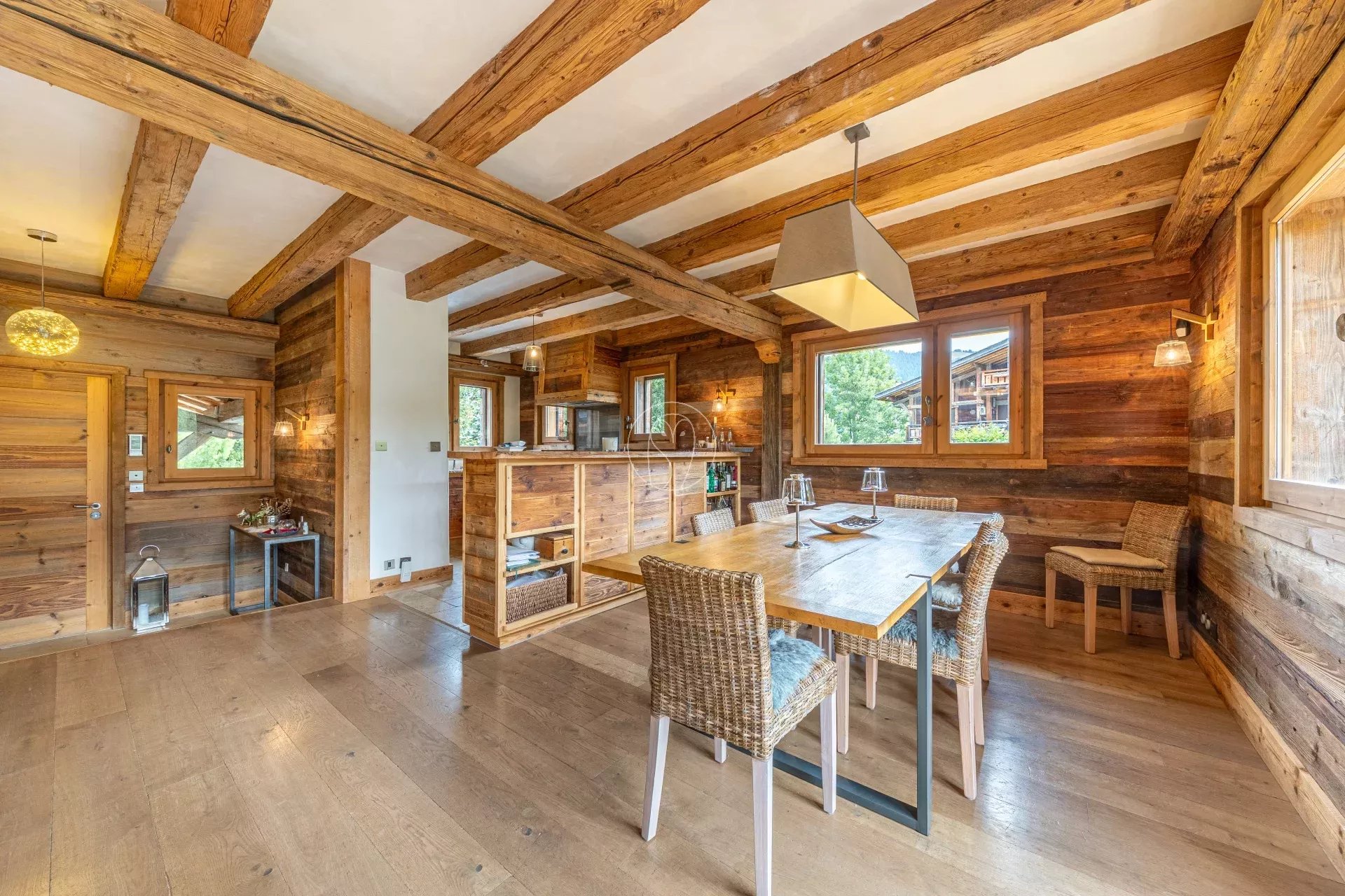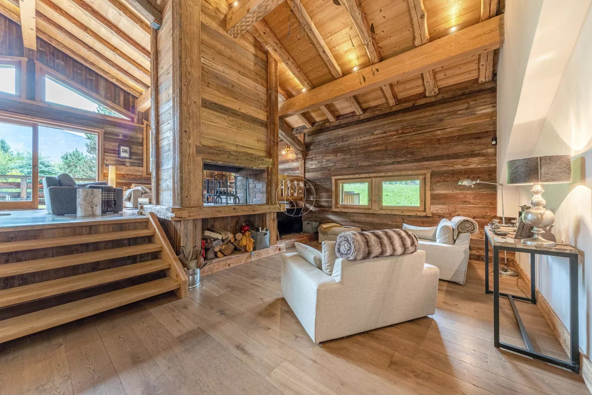 Le rez-de-chaussée comprend une entrée, une cuisine ouverte sur la salle à manger, un double séjour cathédrale avec cheminée centrale et de beaux volumes. L’espace de vie donne accès à une grande terrasse orientée sud-est, équipée d’un Storvatt, ainsi qu’à un jardin offrant une vue dégagée sur les massifs. Une chambre en suite, un ski-room et un garage complètent ce niveau.