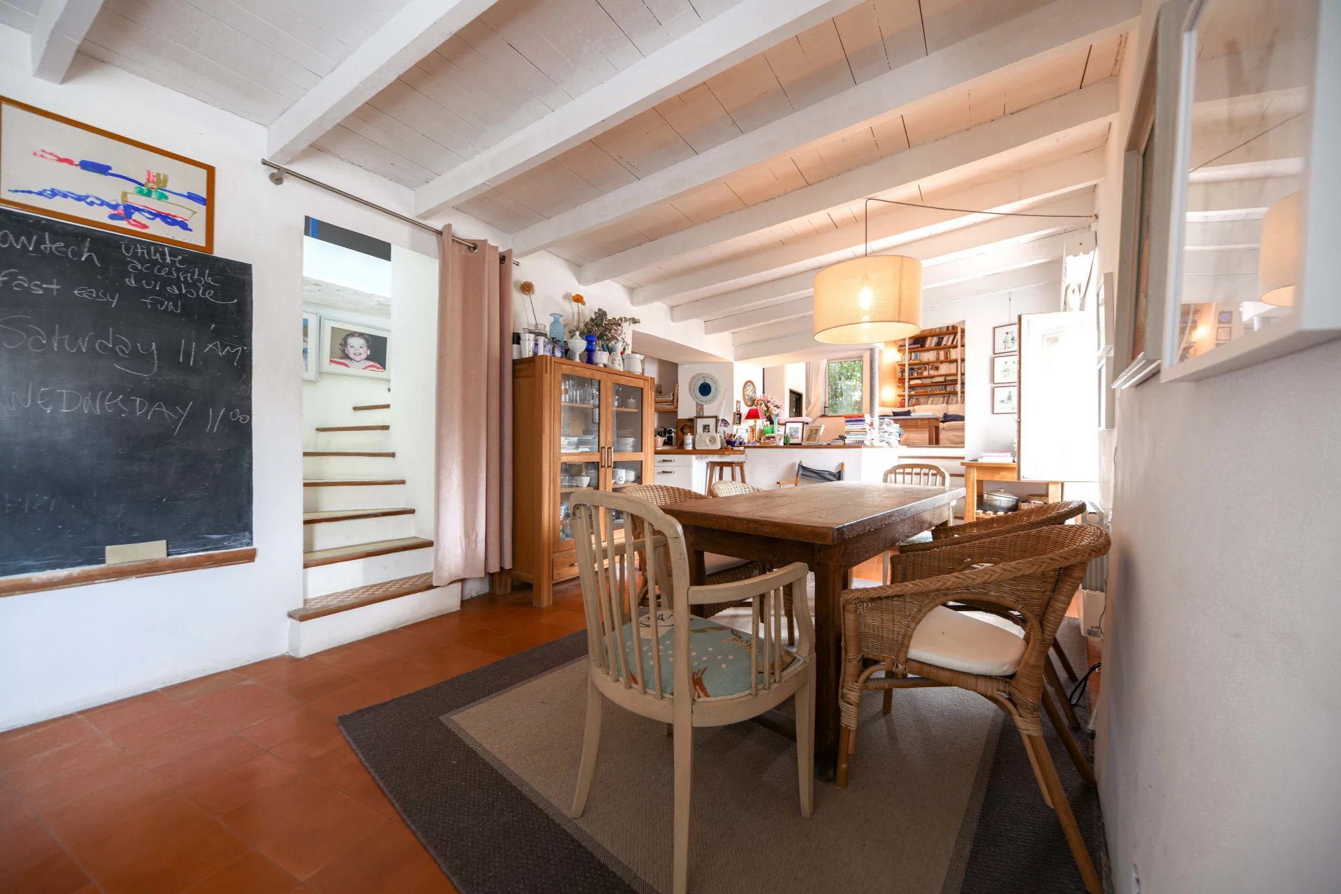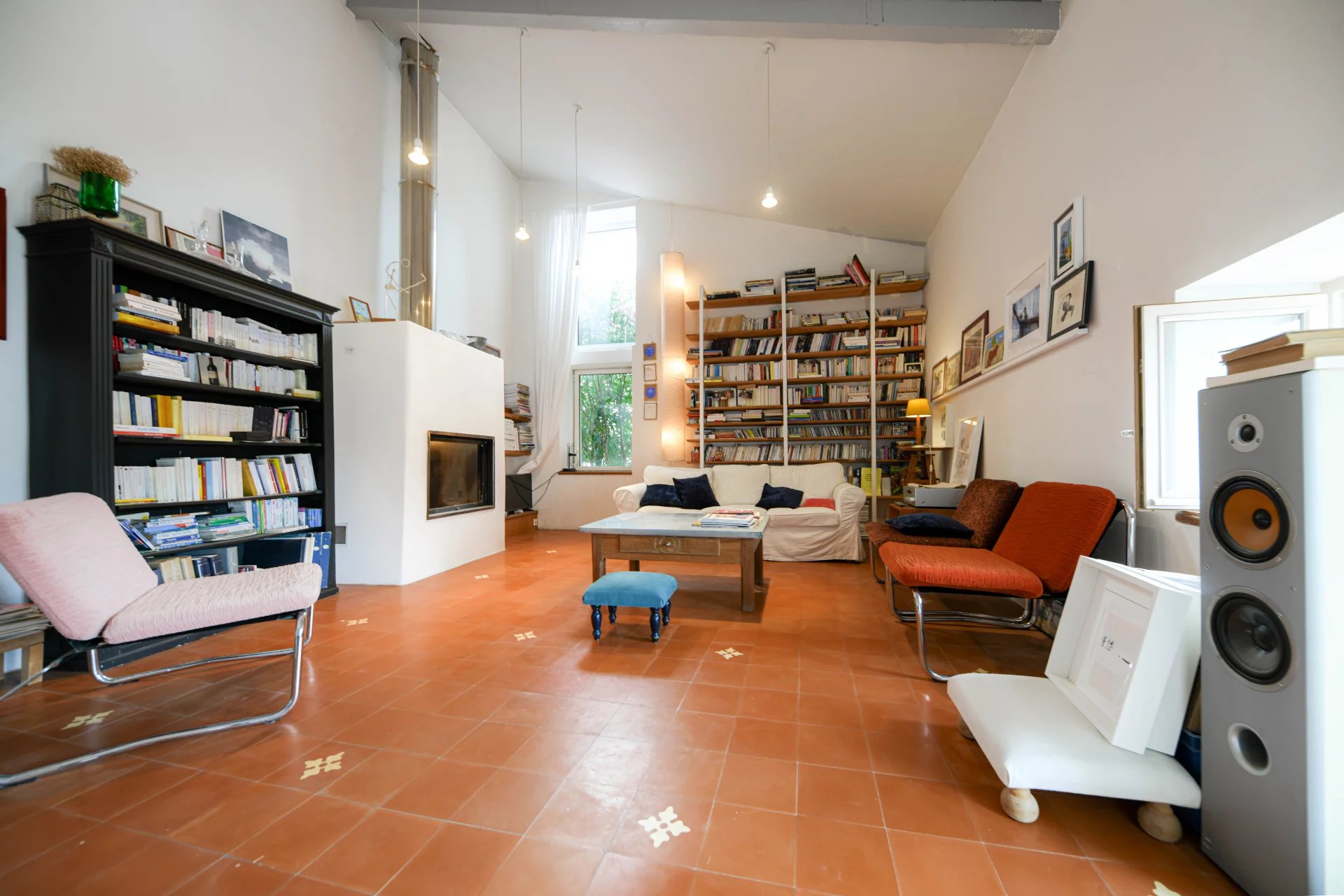 Ensemble de réception de 52.5 m² avec cuisine ouverte, cheminée insert