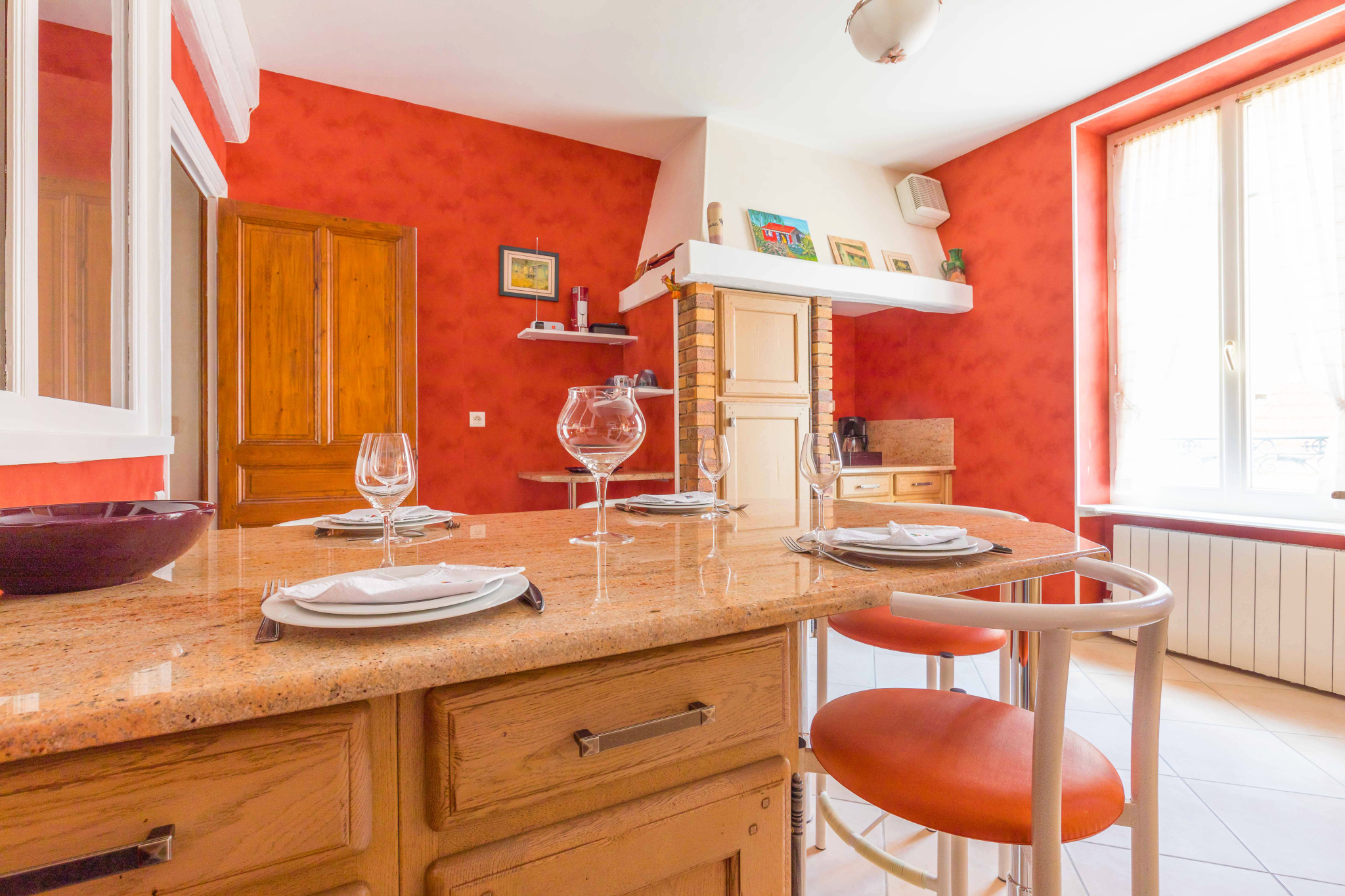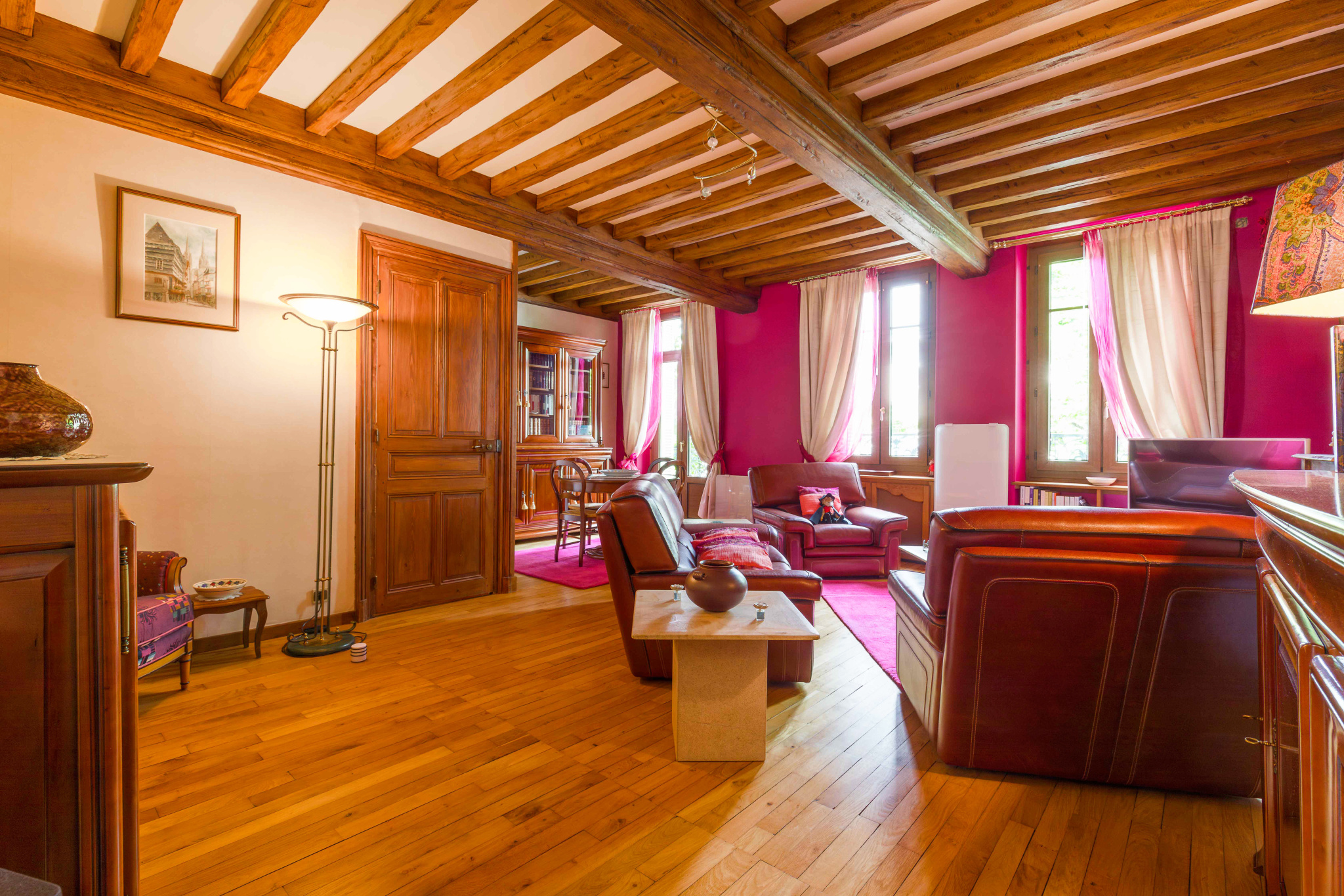 Belle entrée avec placard, séjour/salon parquet et poutres (petit balcon avec rambarde en fer forgé), grande cuisine aménagée et équipée.