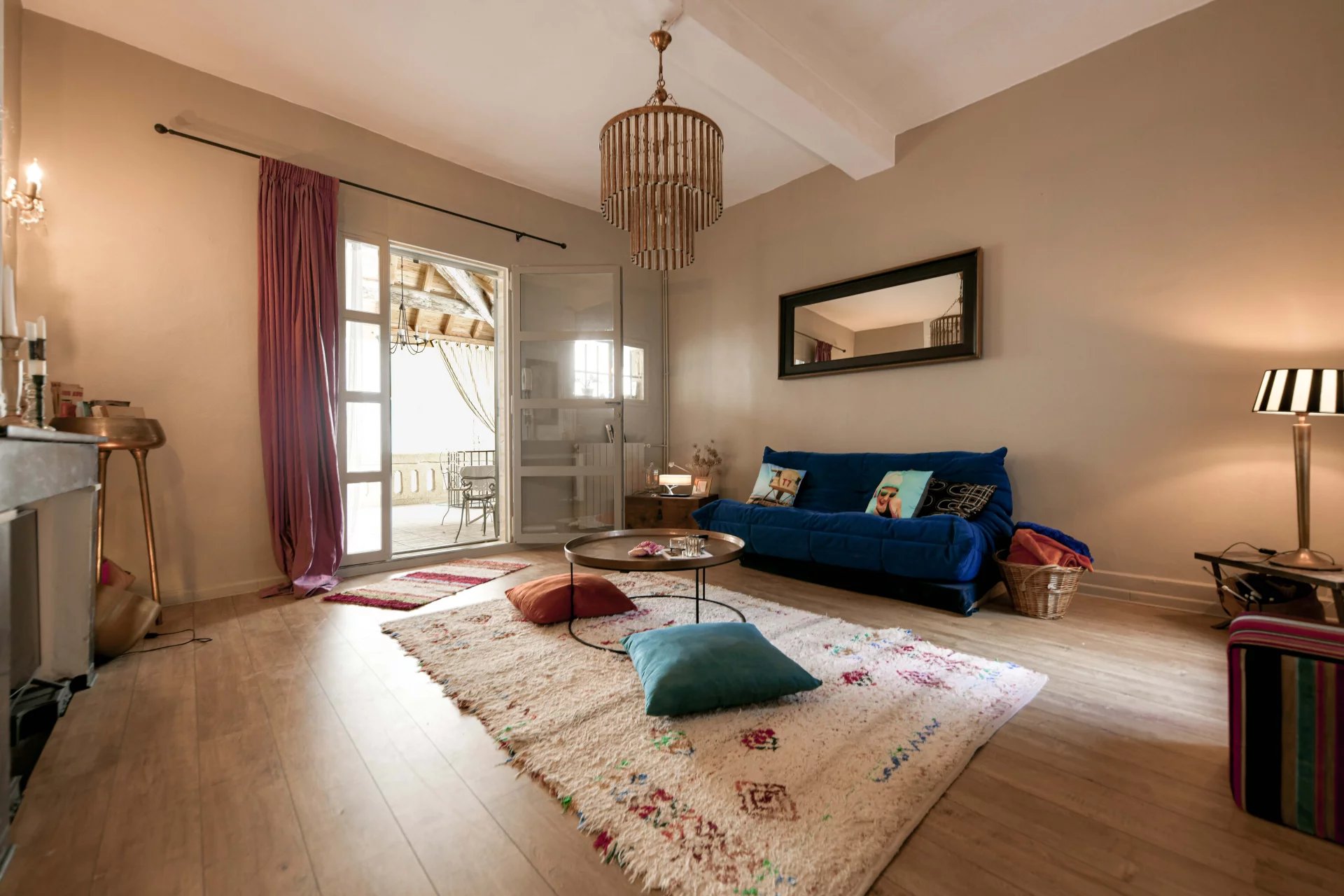 Salon avec cheminée ouvert sur une terrasse de 31 m²