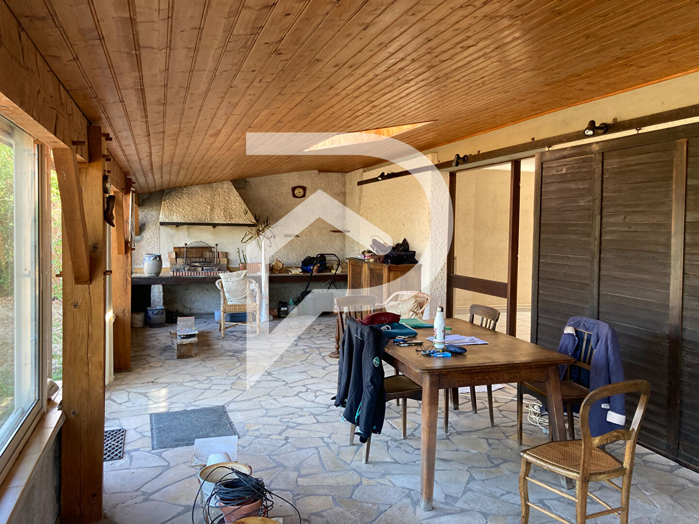 L'entrée dessert une pièce de vie ouvrant sur une grande véranda, une cuisine et une chambre.