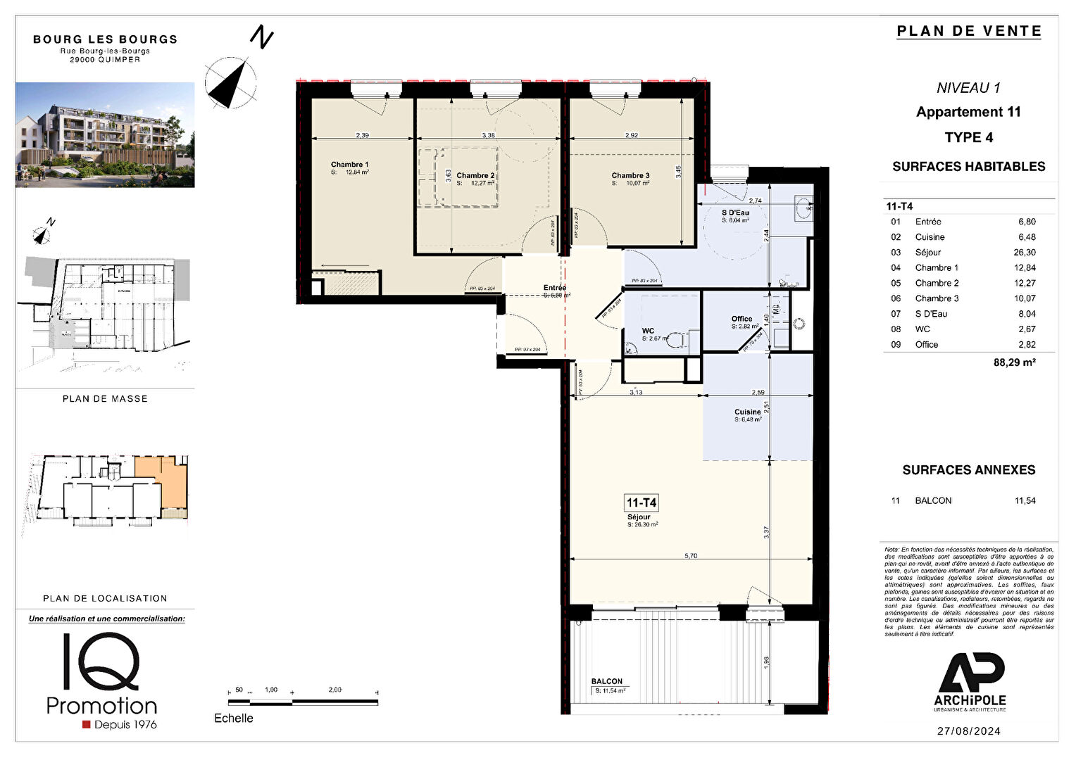 EN EXCLUSIVITÉ - Le nouveau programme immobilier « Bourg Les Bourgs » est situé en centre-ville de Quimper, à quelques minutes à pieds des halles, des commerces et de la cathédrale. Cette résidence de standing d'architecture moderne est composée de 19 appartements neufs, du 2 au 4 pièces avec stationnements privatifs , caves en sous-sol. Parfaitement orienté au Sud, dominant le coeur d'îlot végétalisé du Cap Horn, « Bourg Les Bourgs » est doté des dernières normes en vigueur pour le bien-être , le confort des résidents. Frais de notaire réduits. Livraison Fin 2026. - T4 de 88 m² avec balcon de 11,55 m² au Sud , agréable séjour /cuisine de 32 m², 3 chambres, salle d'eau avec douche "style italienne", arrière-cuisine. Double parking couvert, cave et frais de notaire réduits en sus.