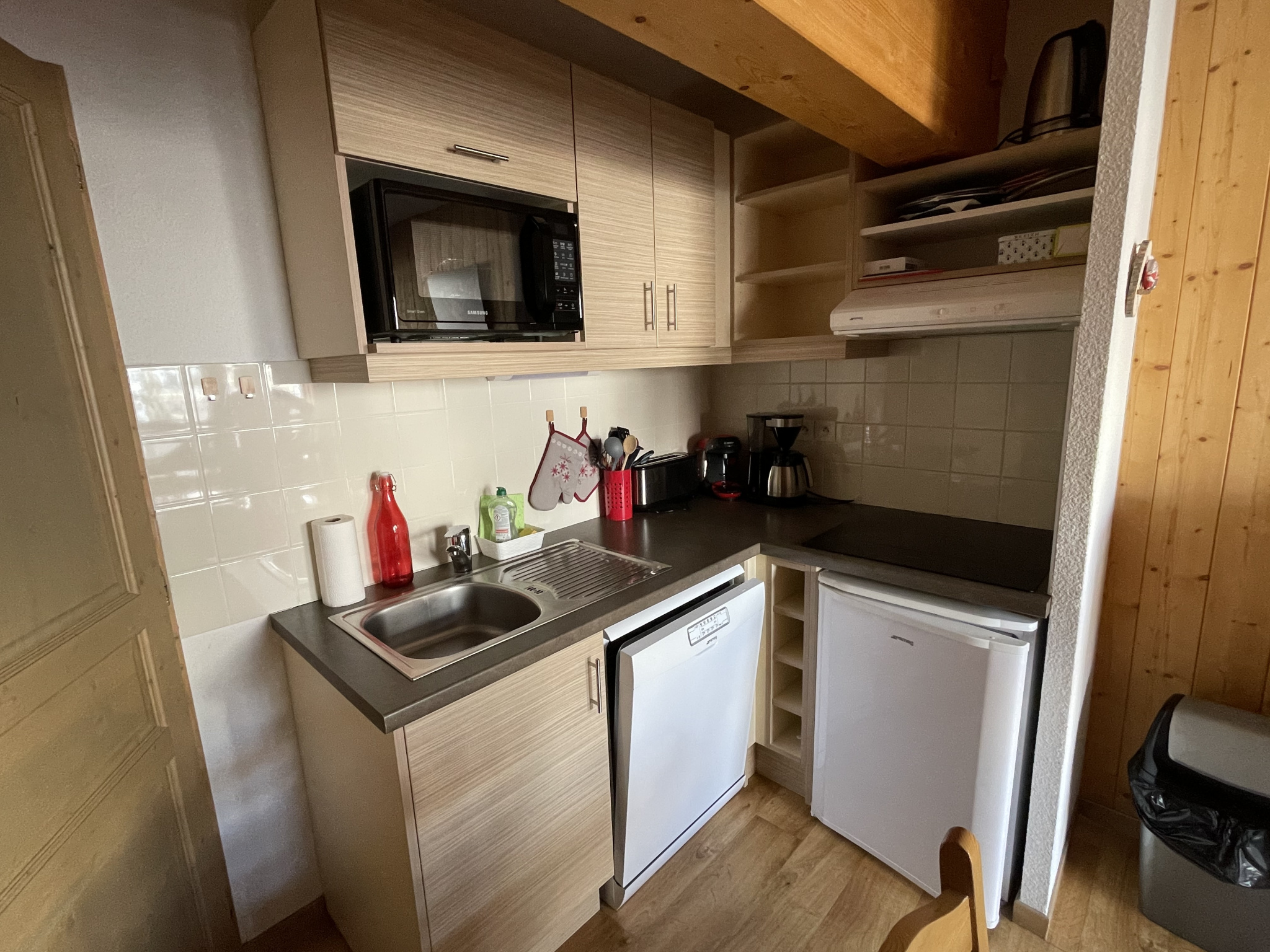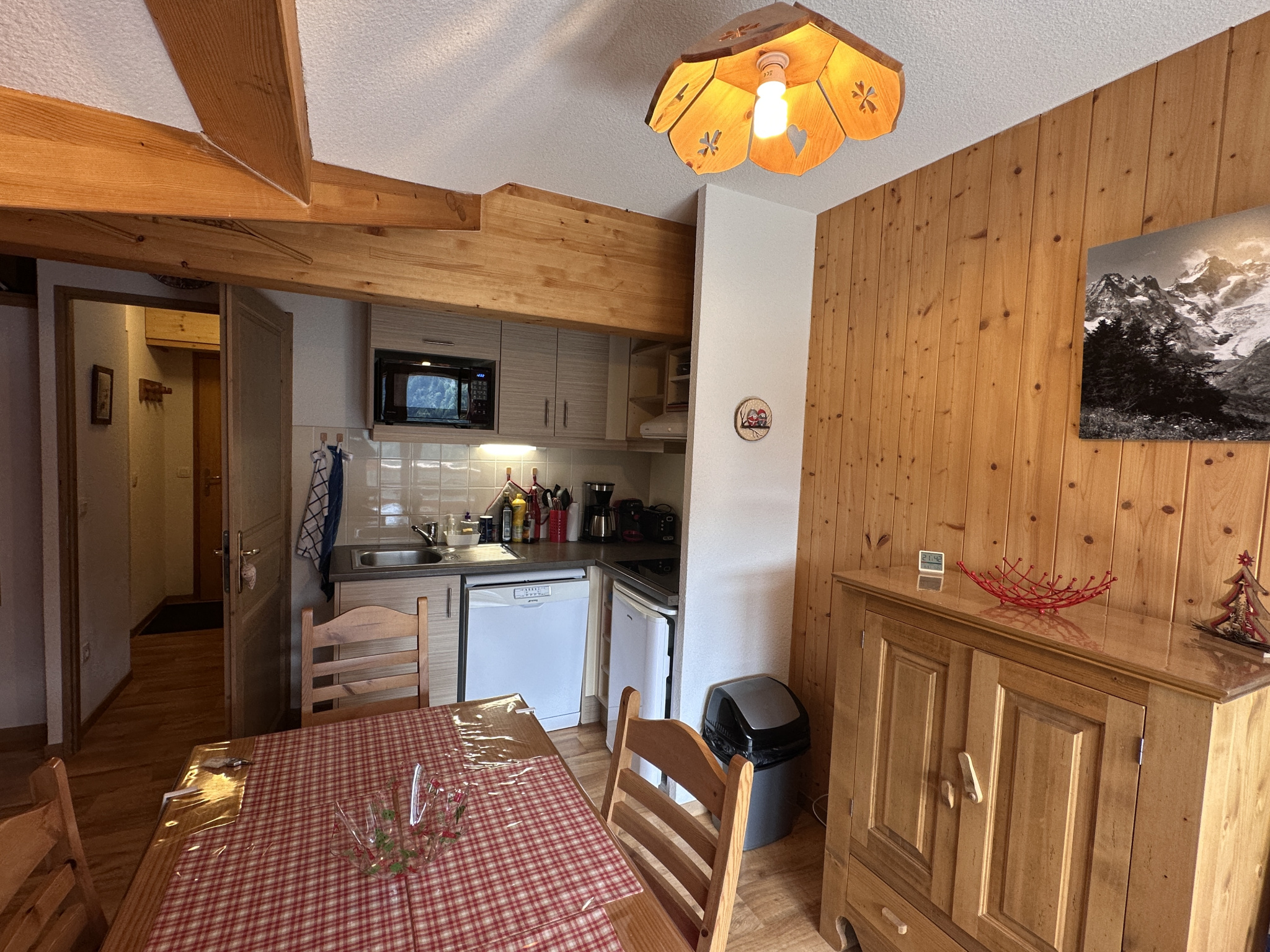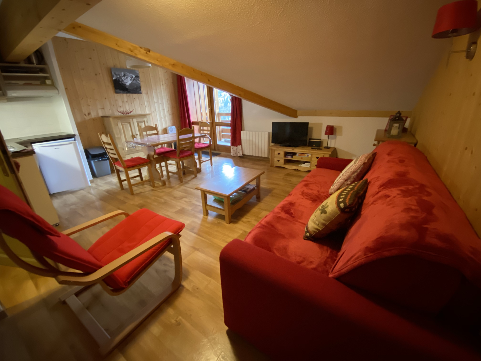 L'appartement comprend une entrée avec rangement, une salle de bains, un WC séparé, une grande alcôve et un séjour avec cuisine donnant sur le balcon. L'appartement ' Ambiance Chalet' se situe au dernier étage avec une partie en soupente donnant un beau volume à la pièce principale. La superficie au sol de l'appartement est de 34,48 m2.