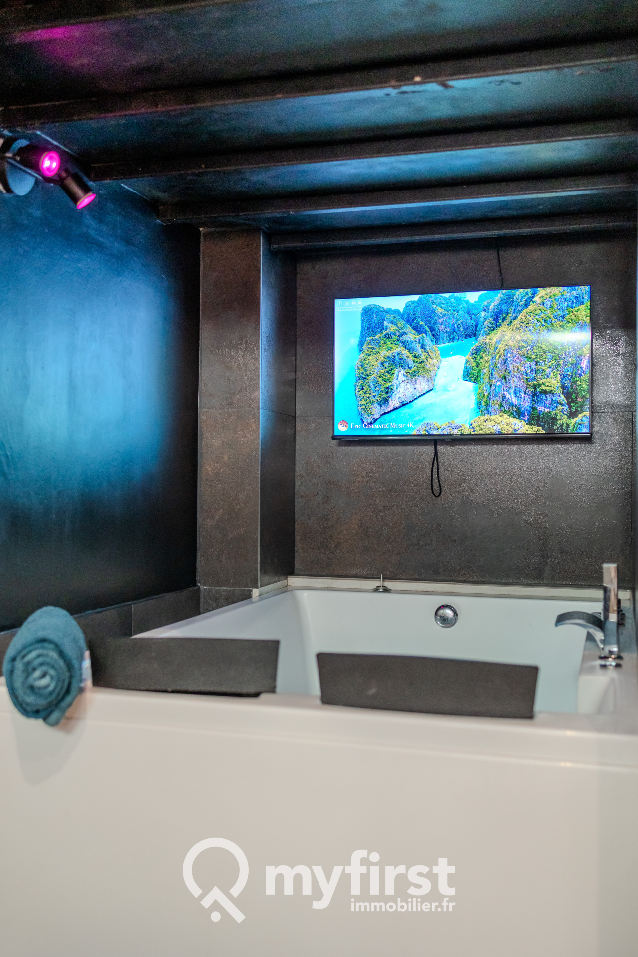 Un espace principal cosy, avec un coin robinetterie discret, une balnéo idéale pour des instants de détente, et bien sûr, tous les petits accessoires... typiques de ce genre d'ambiance.