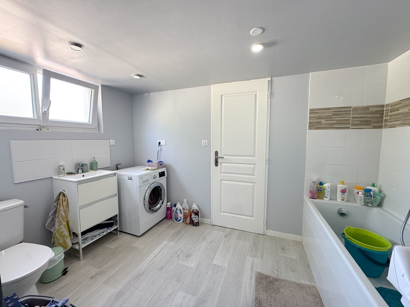 Au rez-de-chaussée : entrée, dégagement, salle de bains avec WC, garage, cave et une chambre.