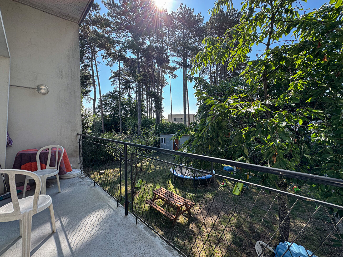 Au premier étage : salon/séjour, deux chambres, salle d'eau, cuisine et dégagement avec placard, un balcon avec exposition SUD.
