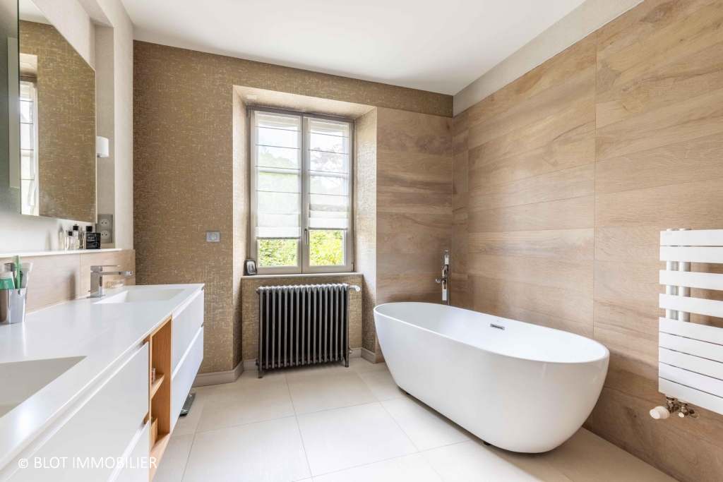 La cuisine haut de gamme s'ouvre sur le jardin et dispose d'une arrière-cuisine. Ce niveau accueille également une suite parentale de 30m² avec dressing, salle de bains et douche.