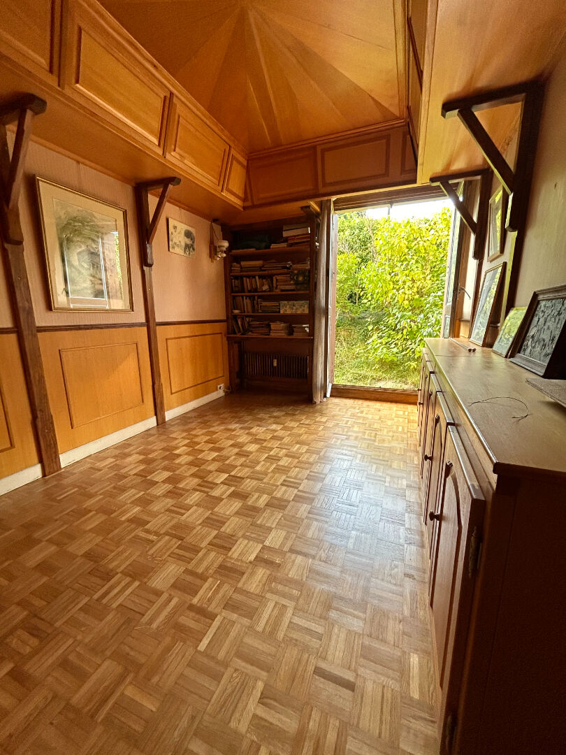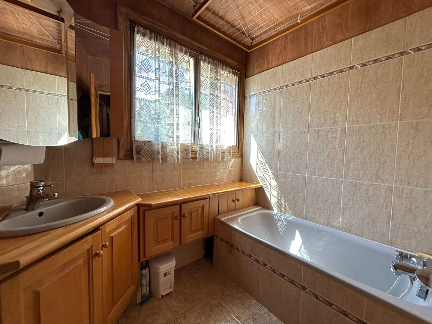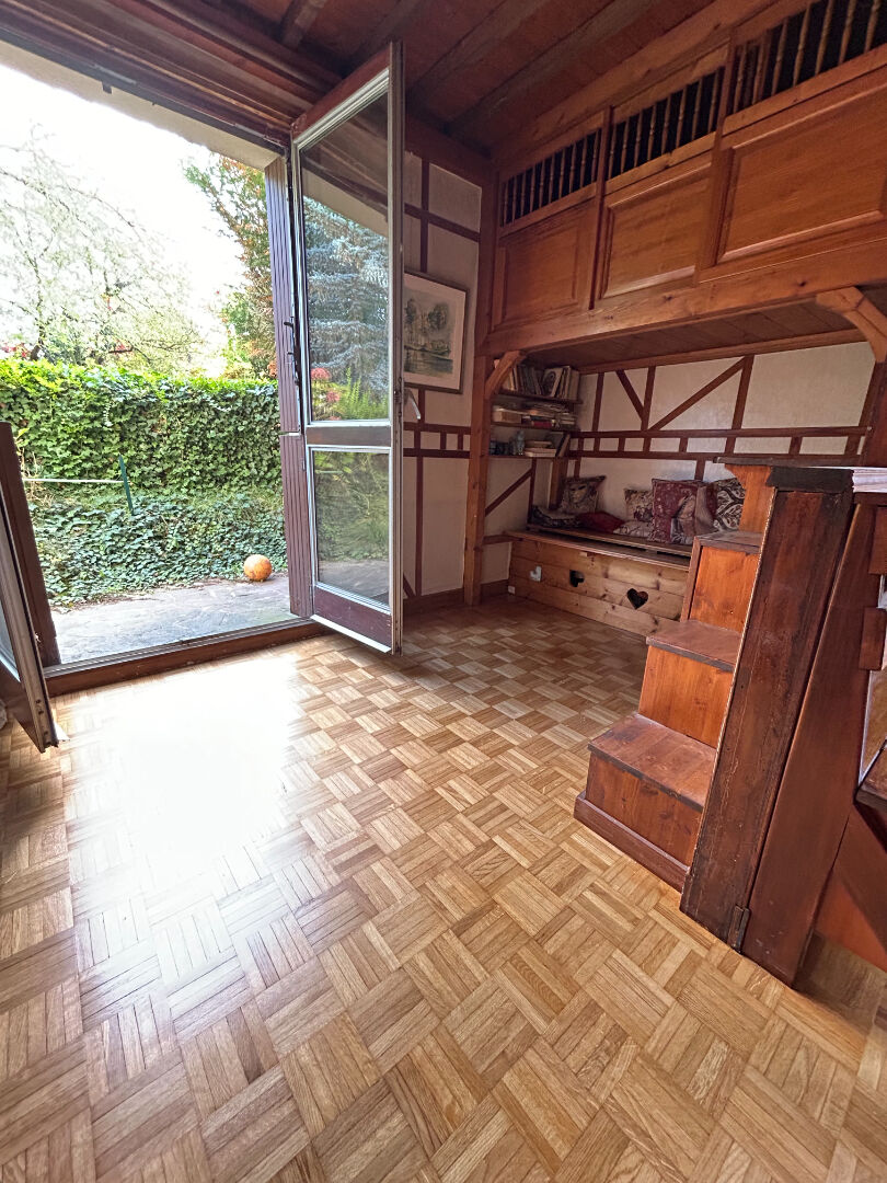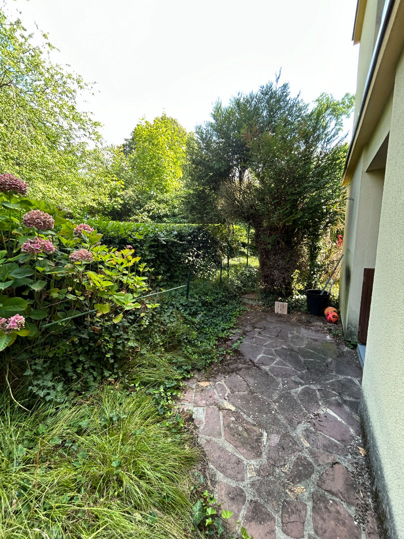 Il comprend une entrée, un séjour double donnant sur une terrasse et un jardin, un dégagement, deux chambres, une salle de bains et des WC. Une cave et un parking privatif sont également inclus.