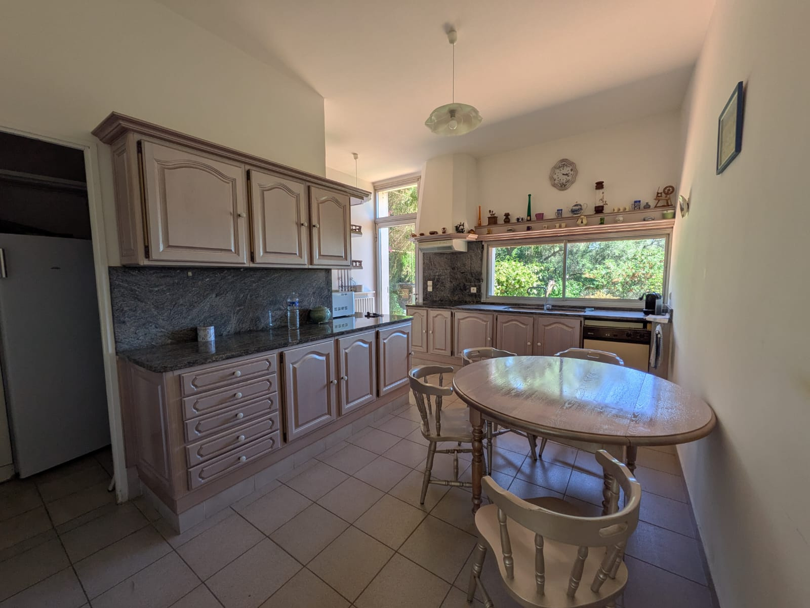 Une cuisine indépendante de 18 m2 avec cellier, donnant également sur le jardin et une terrasse avec aperçu mer,