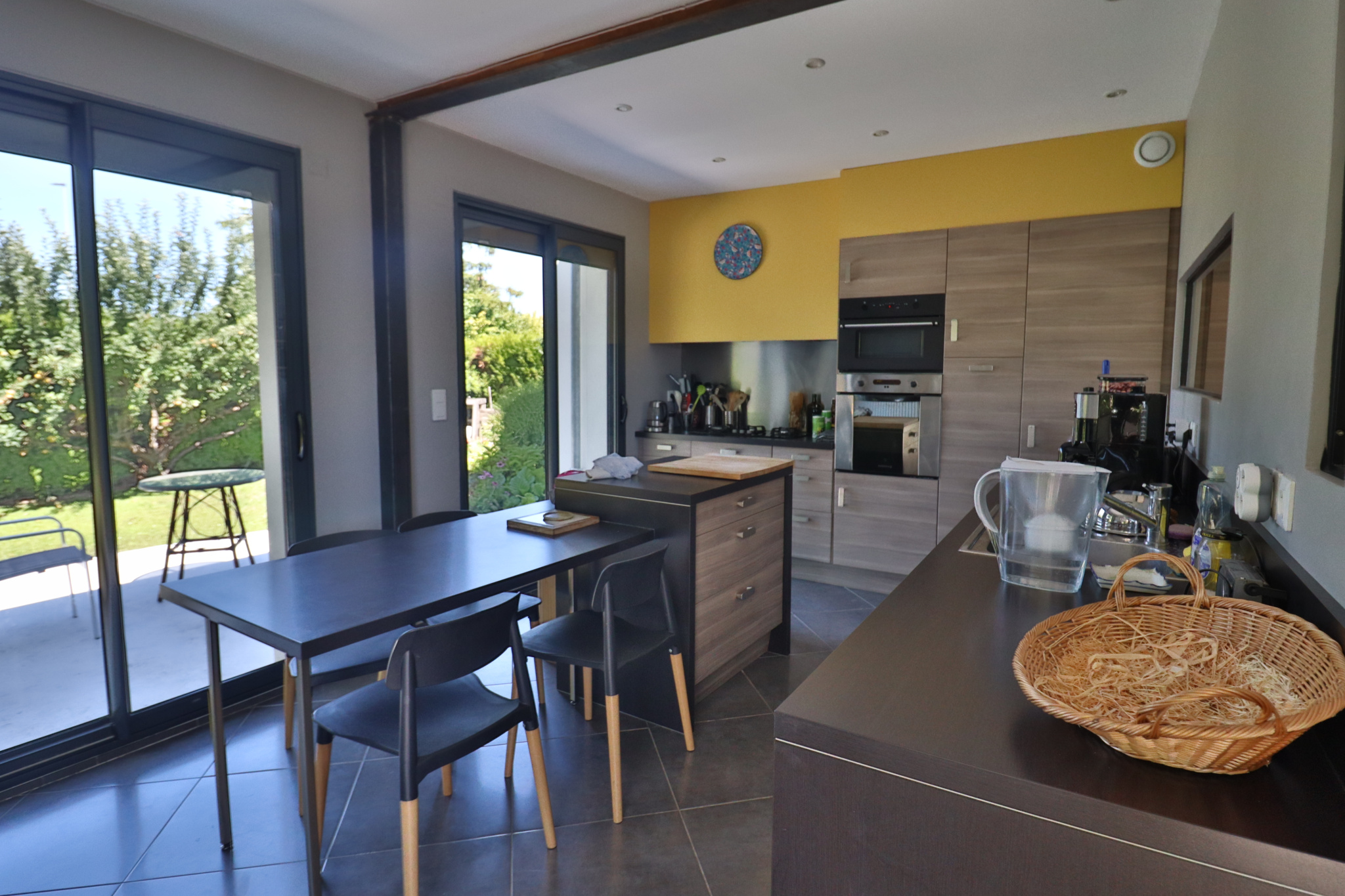 Une maison pleine de charme de 154 m2, composée d'une entrée desservant un salon lumineux, une cuisine équipée et une buanderie. Cette maison offre un véritable confort de plain-pied avec une suite parentale, un dressing, des WC indépendants et une salle d'eau.