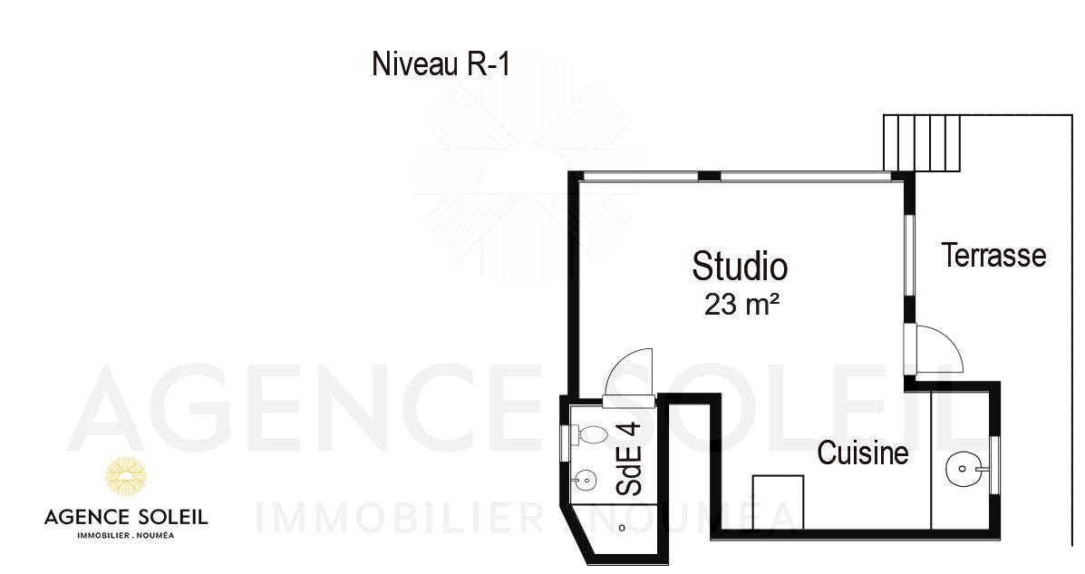 Un studio comprenant une pièce principale, un coin cuisine, une salle d'eau avec wc et une terrasse dispose d'un accès totalement indépendant.