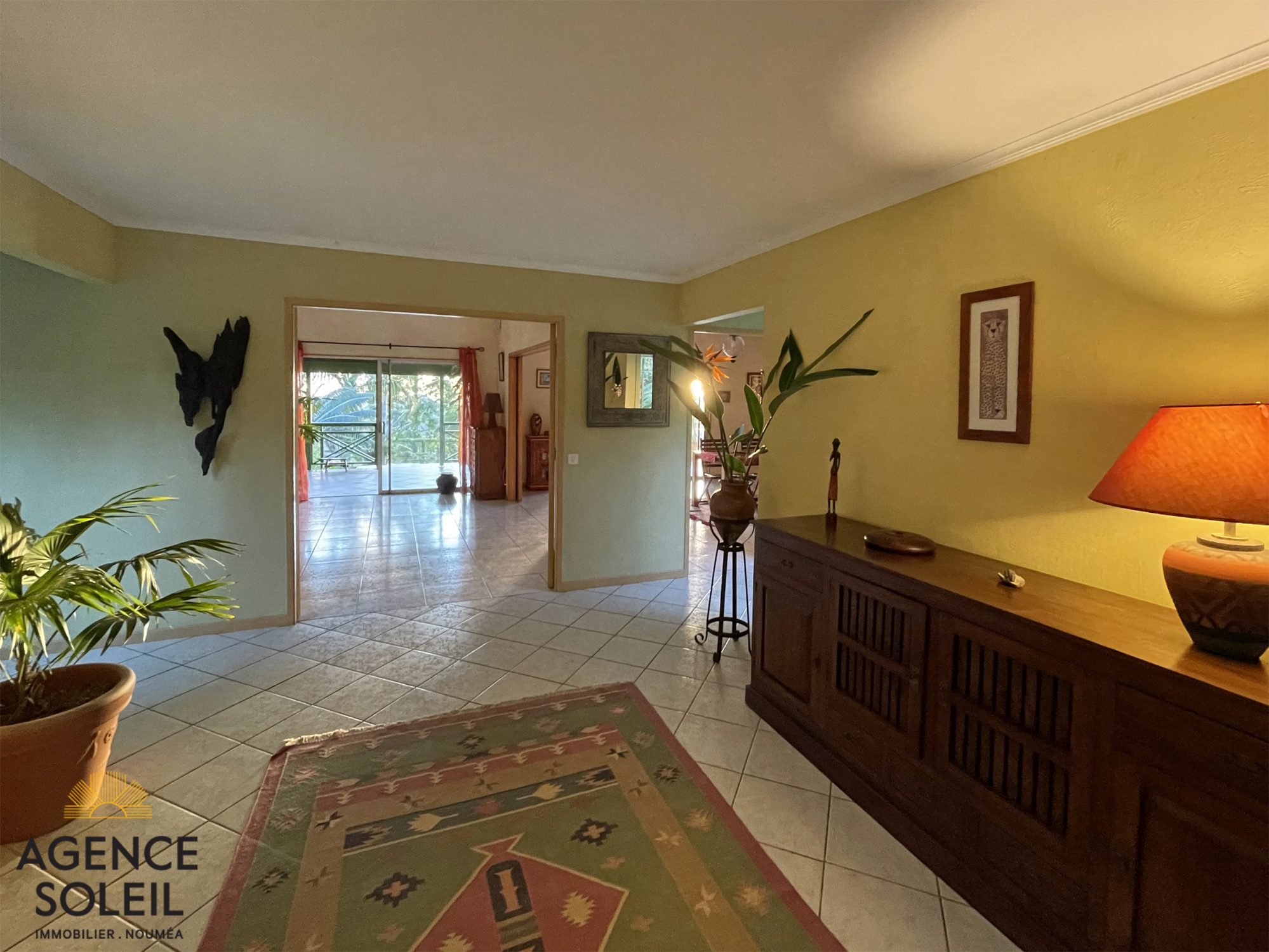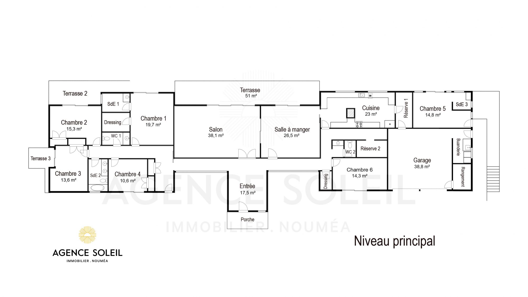 La distribution est la suivante: un grand hall d'entrée, un séjour et une salle à manger ouvrant sur une terrasse couverte, une cuisine, six chambres dont deux avec salle d'eau et wc, une salle de bain, deux WC séparés, une buanderie, deux pièces de rangement.